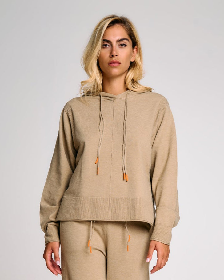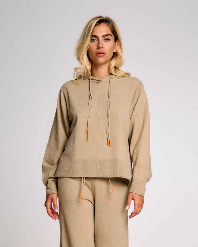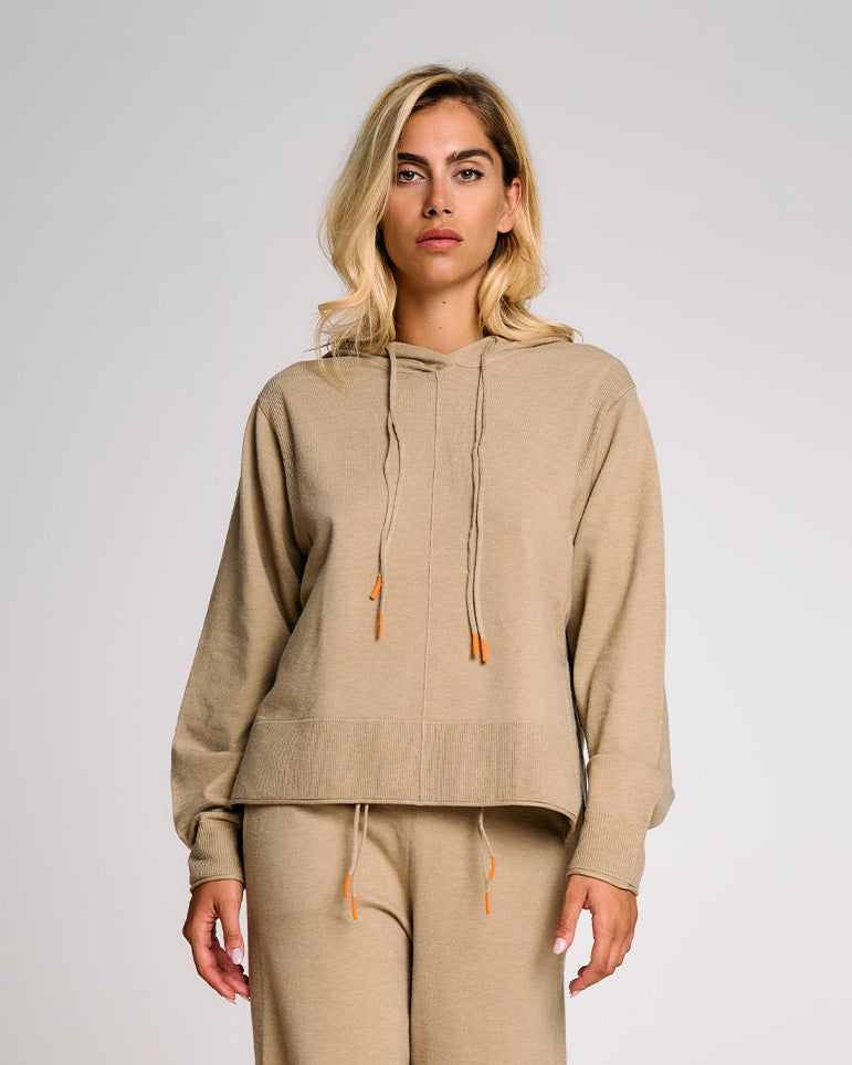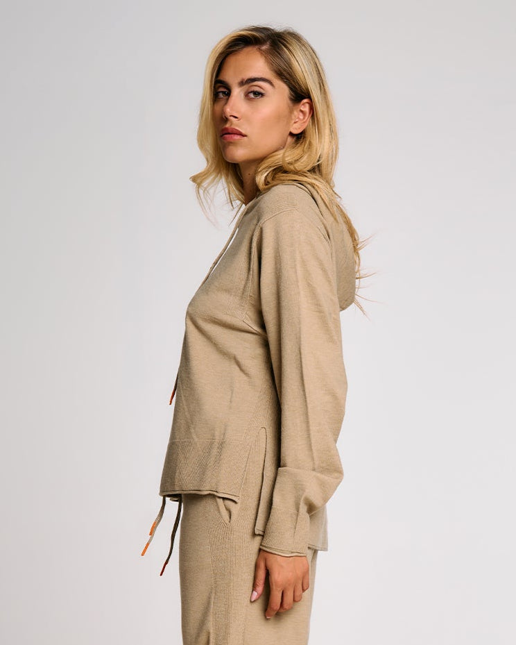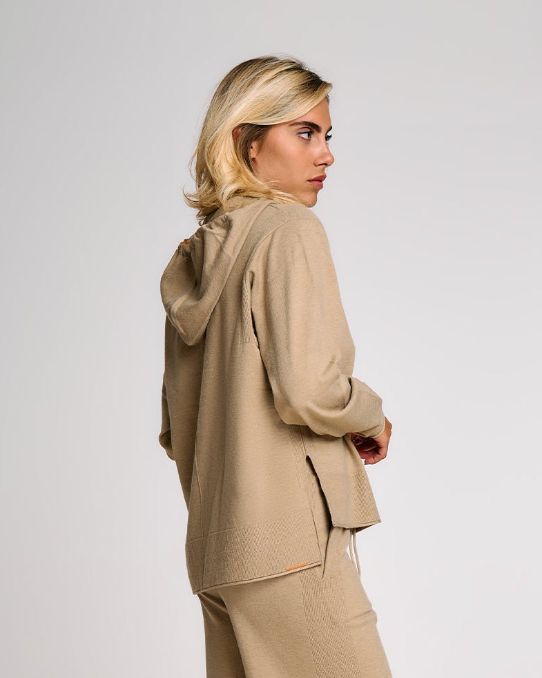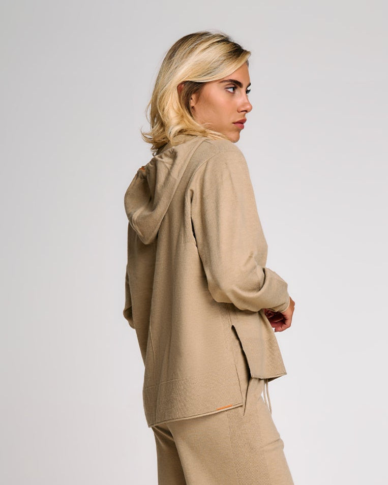 Una felpa in maglia donna dal taglio morbido e contemporaneo, ideale per completare look rilassati ma sofisticati. Il cappuccio regolabile con coulisse aggiunge un tocco funzionale, mentre i polsi alti e gli spacchi laterali donano struttura al capo senza comprometterne la fluidità. La lavorazione in maglia effetto cashmere valorizza l’appeal materico del tessuto, rendendo questa felpa un alleato perfetto per il tempo libero con stile. Può essere abbinata al pantalone in maglia coordinato per un total look armonico.