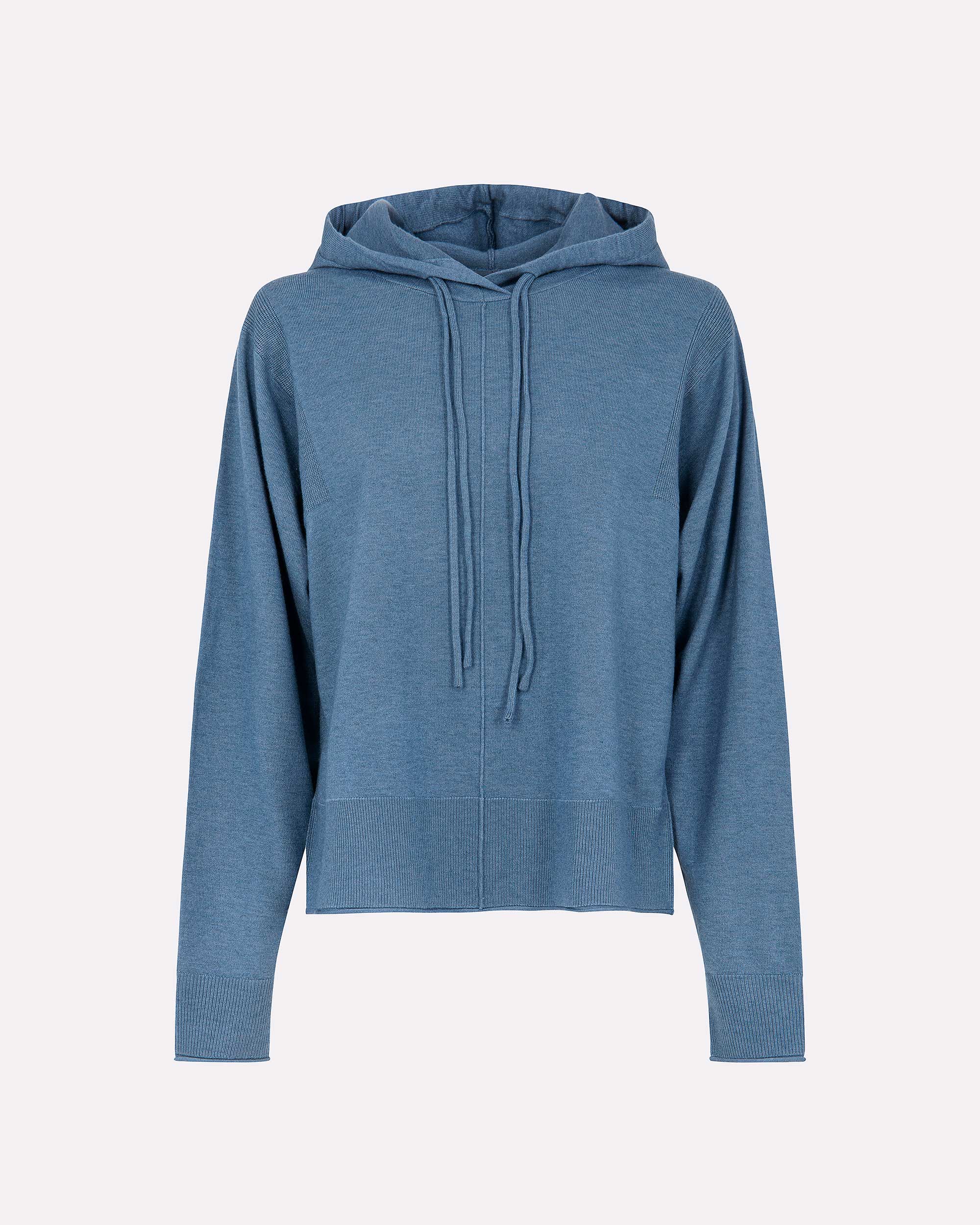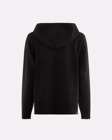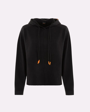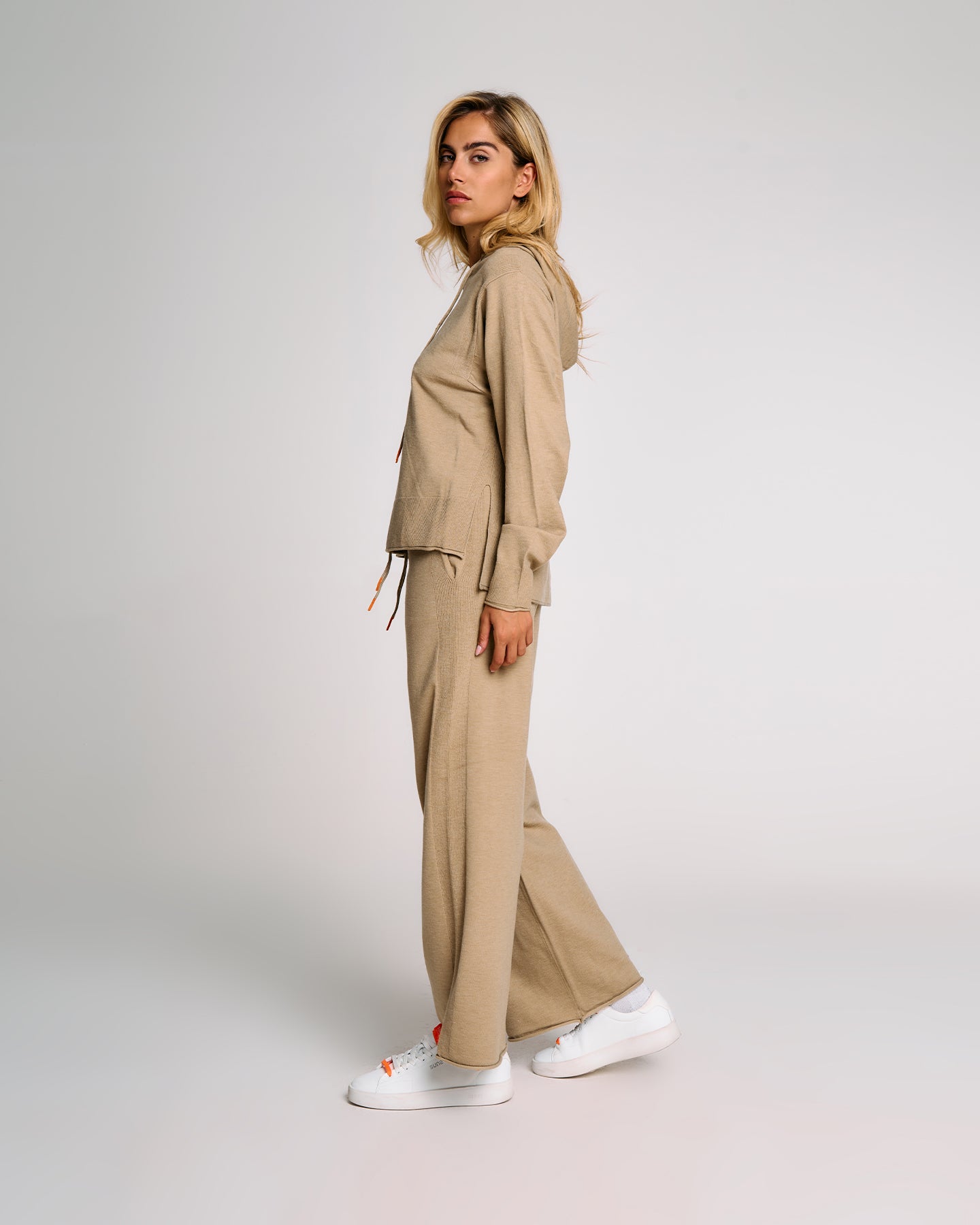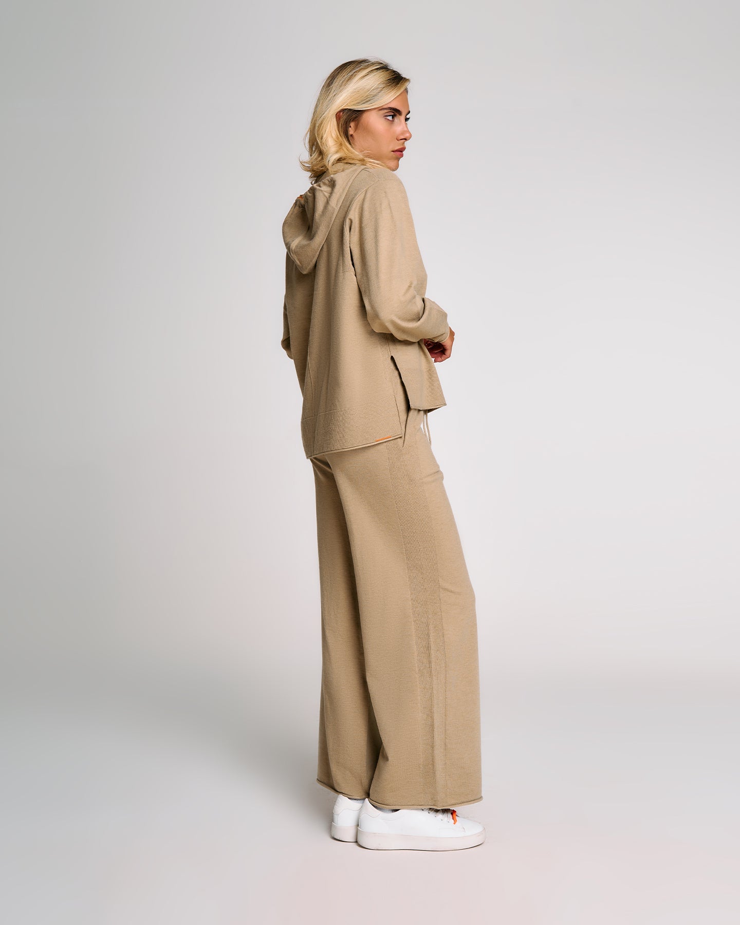 Una felpa in maglia donna dal taglio morbido e contemporaneo, ideale per completare look rilassati ma sofisticati. Il cappuccio regolabile con coulisse aggiunge un tocco funzionale, mentre i polsi alti e gli spacchi laterali donano struttura al capo senza comprometterne la fluidità. La lavorazione in maglia effetto cashmere valorizza l’appeal materico del tessuto, rendendo questa felpa un alleato perfetto per il tempo libero con stile. Può essere abbinata al pantalone in maglia coordinato per un total look armonico.