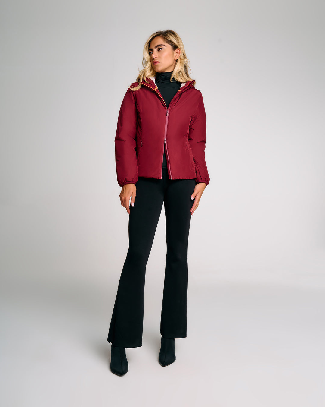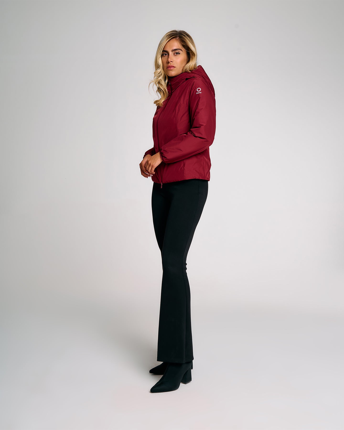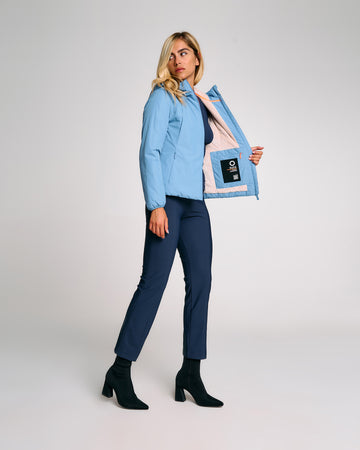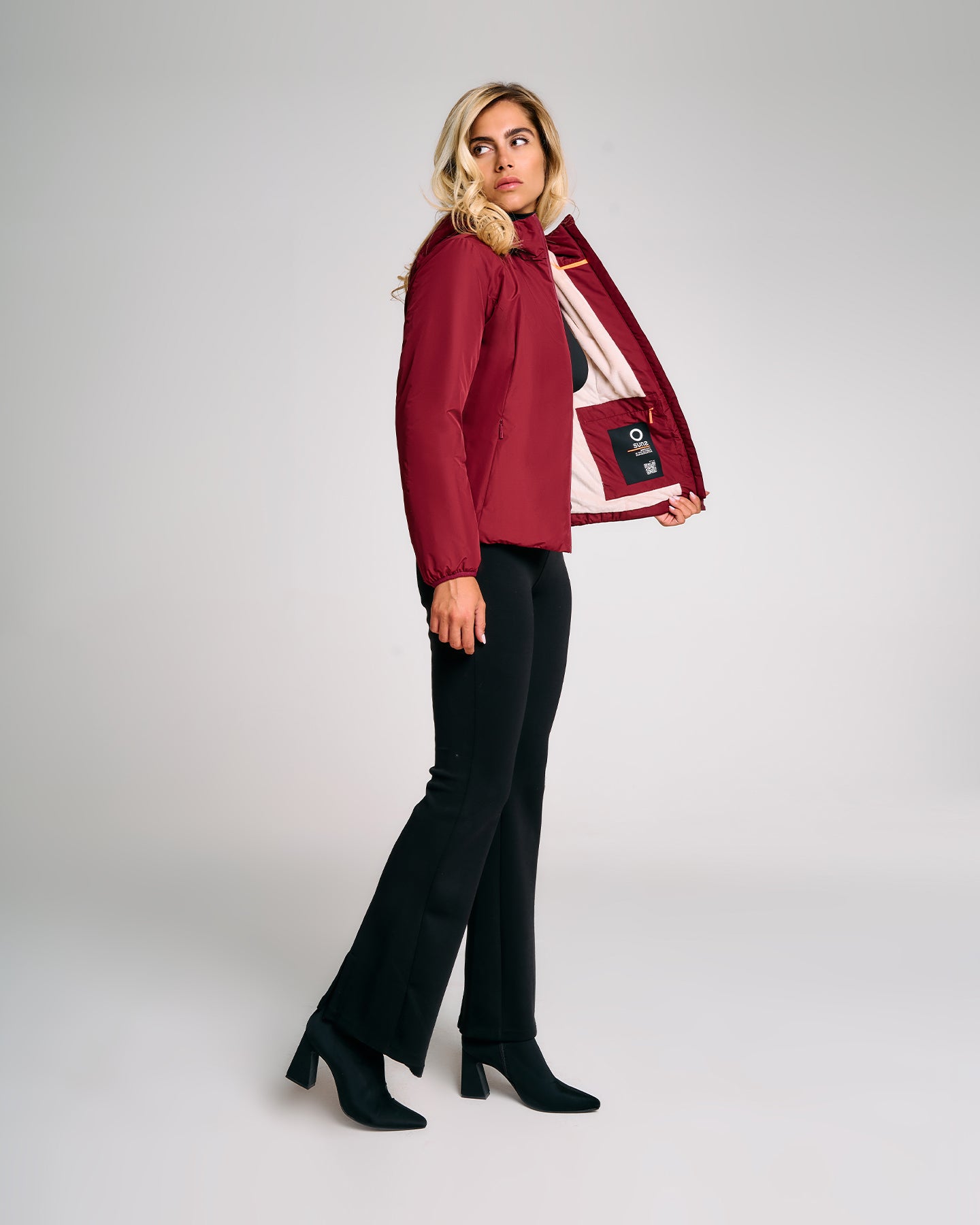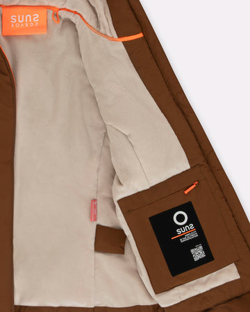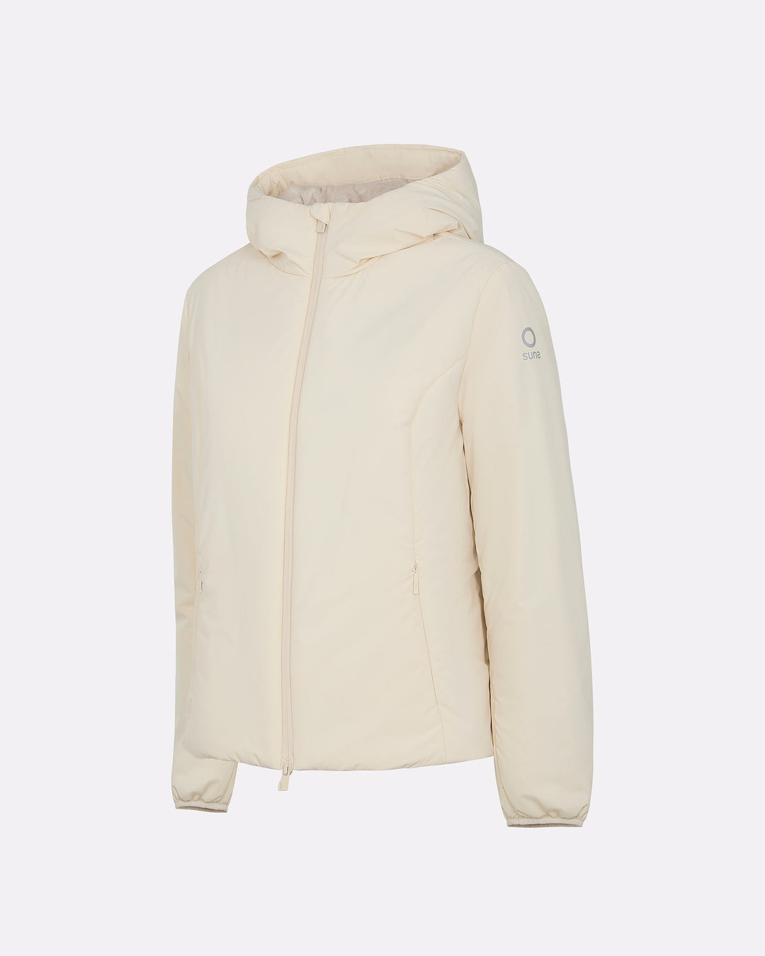 Giubbotto tecnico da donna progettato per unire protezione, comfort e funzionalità nei climi più freschi. L’interno è interamente rivestito in eco fur rasata, morbida e termica. Il cappuccio fisso presenta una costruzione termosaldata e coulisse regolabile con stopper in metallo. La zip frontale a doppio cursore è termosaldata e idrorepellente, perfettamente integrata nel design pulito del capo. Le tasche laterali con zip invisibili e termosaldate offrono praticità senza compromettere la linea. Le maniche ergonomiche con fondo in lycra nera migliorano l’adattabilità. Il capo è completato dalla pinnetta arancione fluo, elemento distintivo del brand Suns, sempre posizionata sul fianco lato destro.
