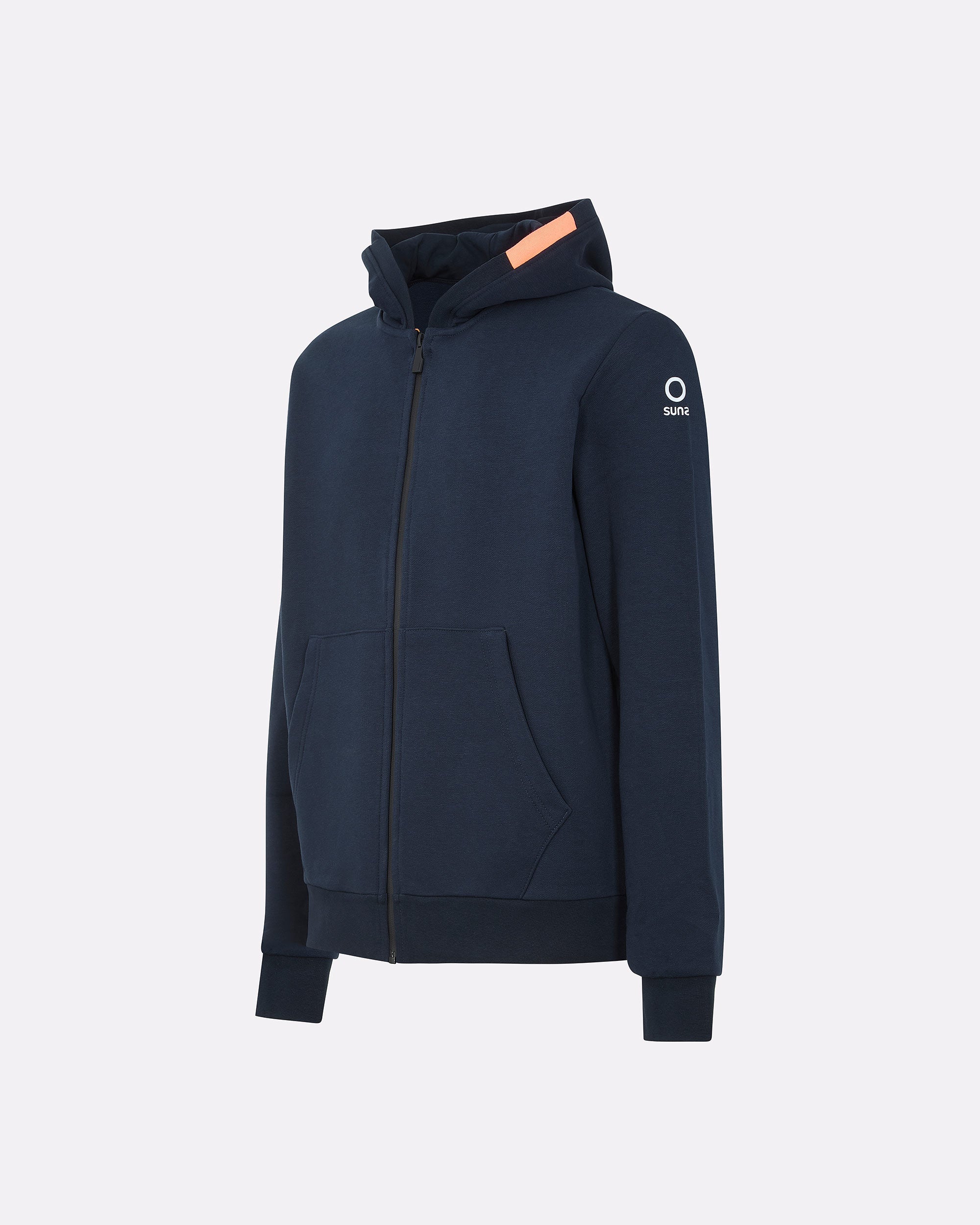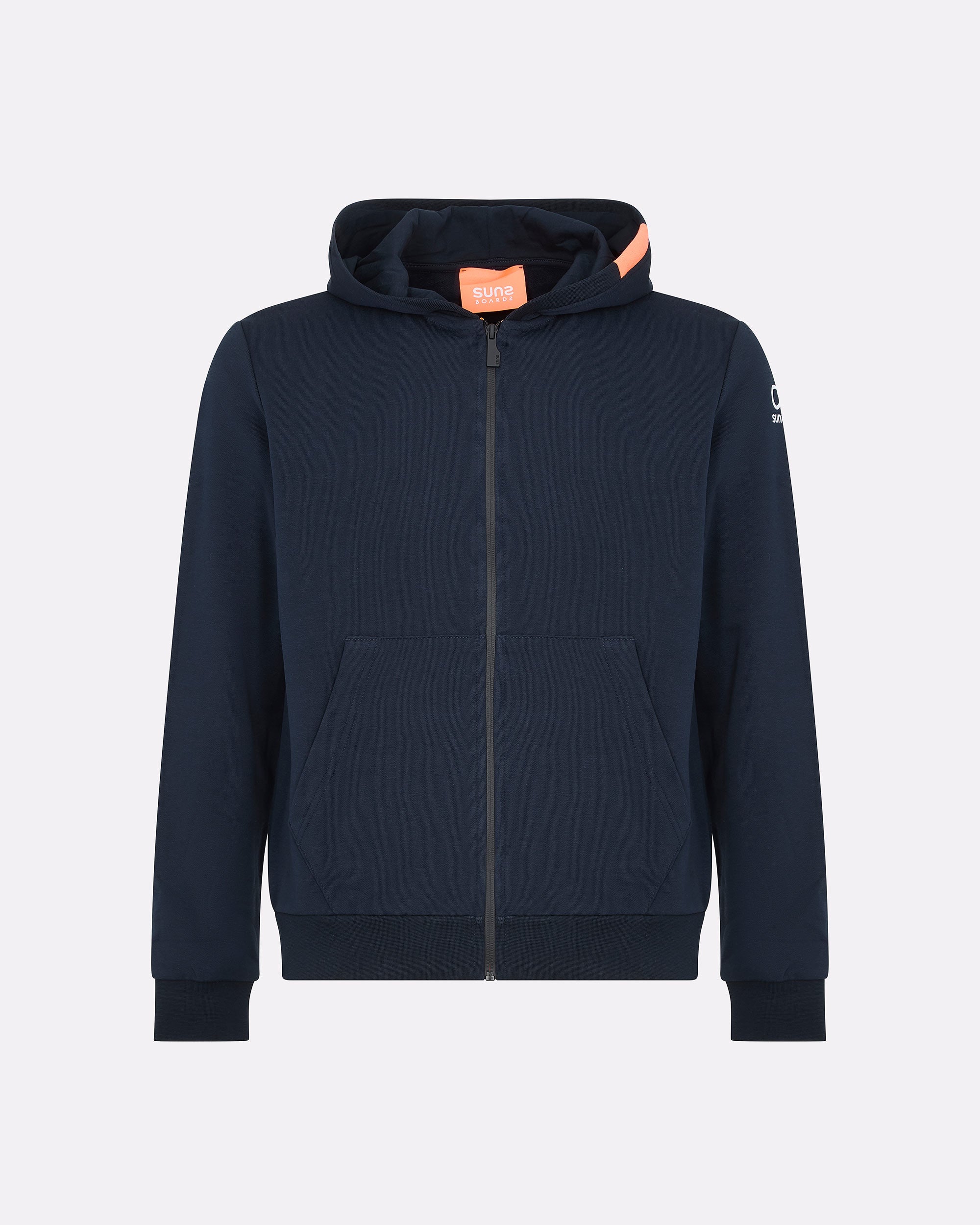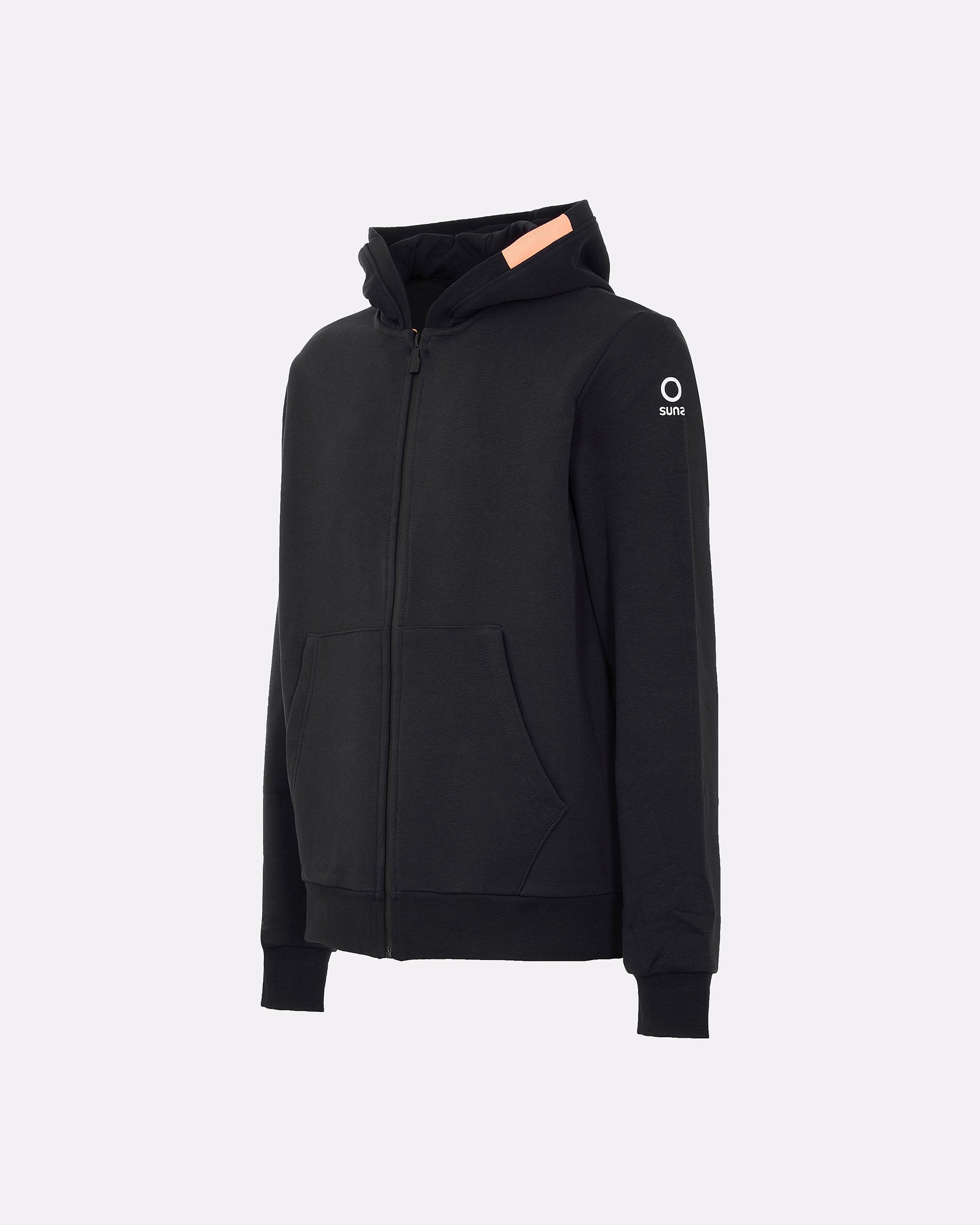 Questa felpa uomo con cappuccio unisce comfort, stile e praticità in un design versatile perfetto per ogni giorno. Realizzata in felpa diagonale dal peso consistente, offre calore e struttura senza rinunciare alla morbidezza. Il cappuccio regolabile con interno in jersey tono su tono e la zip frontale bicolore impermeabile con slider nero esterno e interno arancione, sono dettagli distintivi del capo. Le tasche laterali a filetto, i polsini e il fondo in costina aggiungono funzionalità e aderenza. Il logo reflective Suns applicato sulla manica sinistra e il caratteristico inserto arancione fluo sul fianco destro completano lo stile iconico del brand.