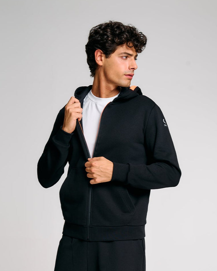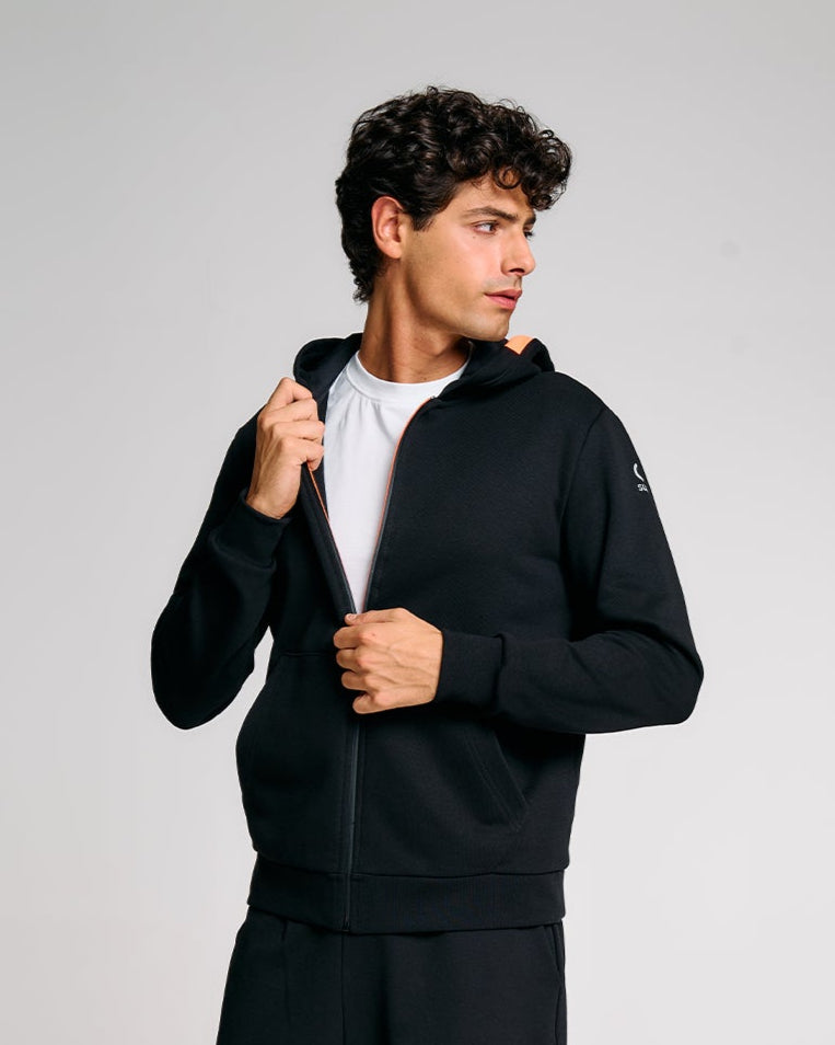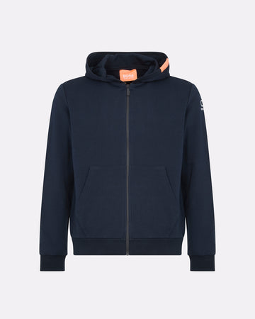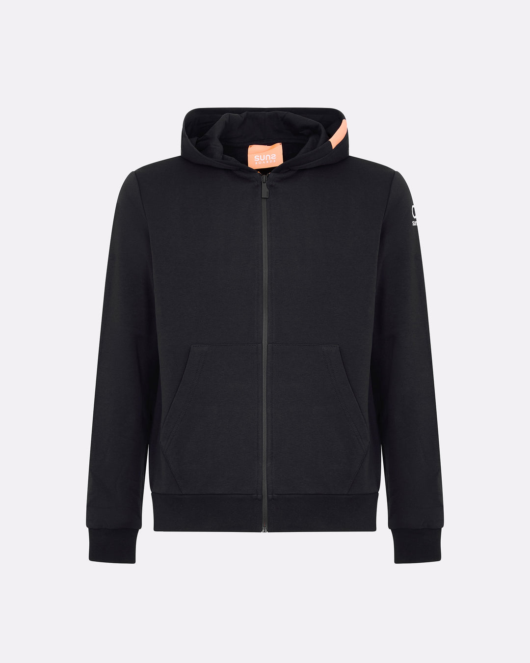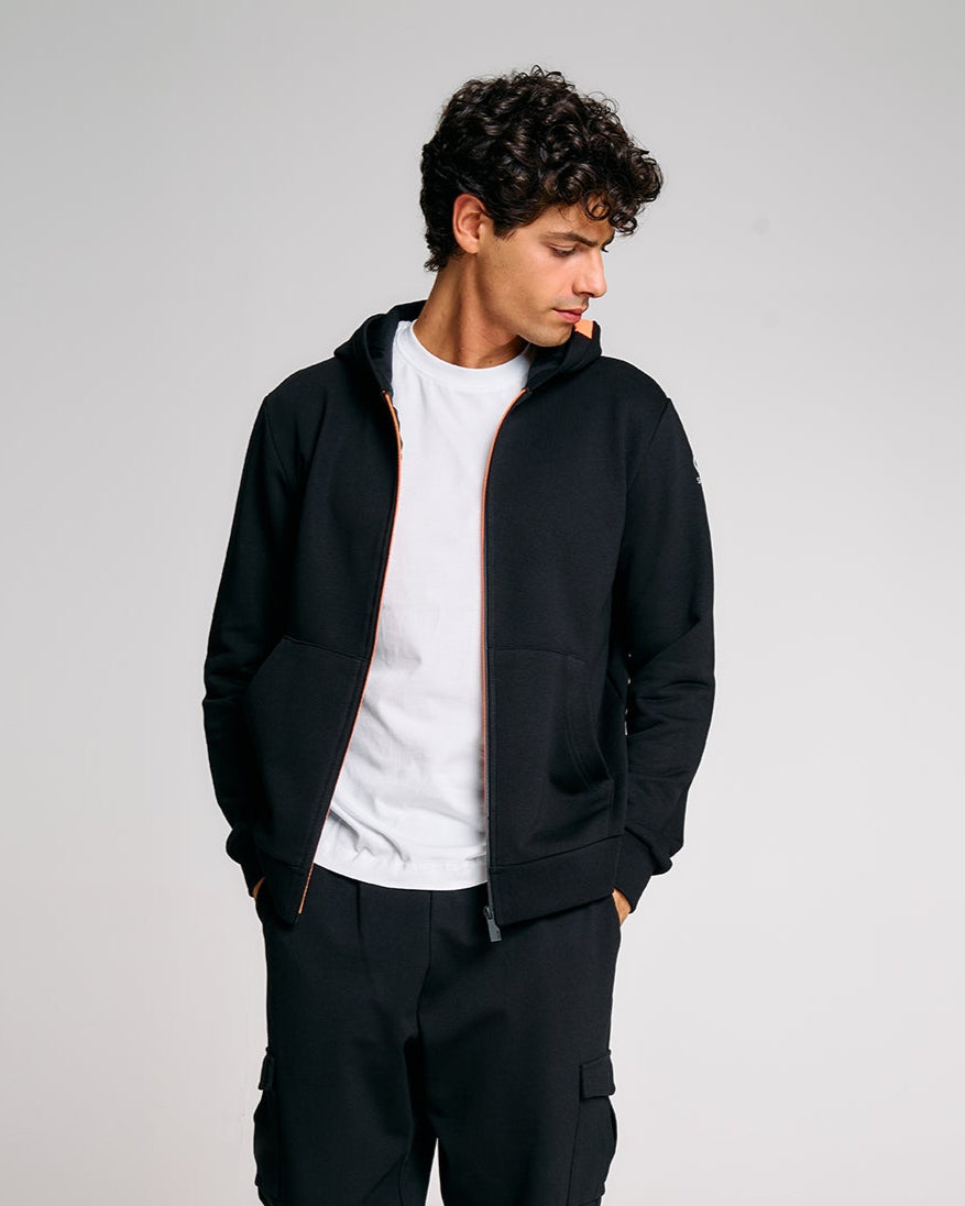 Questa felpa uomo con cappuccio unisce comfort, stile e praticità in un design versatile perfetto per ogni giorno. Realizzata in felpa diagonale dal peso consistente, offre calore e struttura senza rinunciare alla morbidezza. Il cappuccio regolabile con interno in jersey tono su tono e la zip frontale bicolore impermeabile con slider nero esterno e interno arancione, sono dettagli distintivi del capo. Le tasche laterali a filetto, i polsini e il fondo in costina aggiungono funzionalità e aderenza. Il logo reflective Suns applicato sulla manica sinistra e il caratteristico inserto arancione fluo sul fianco destro completano lo stile iconico del brand.