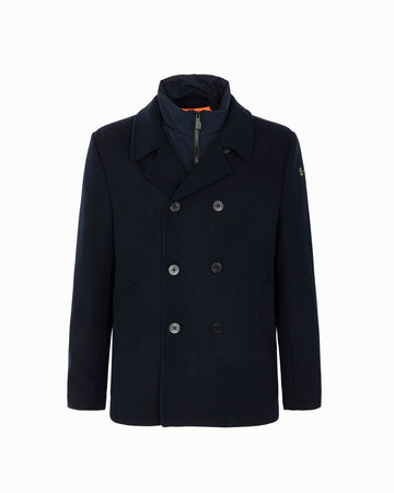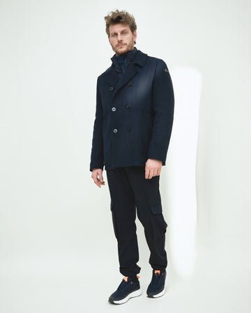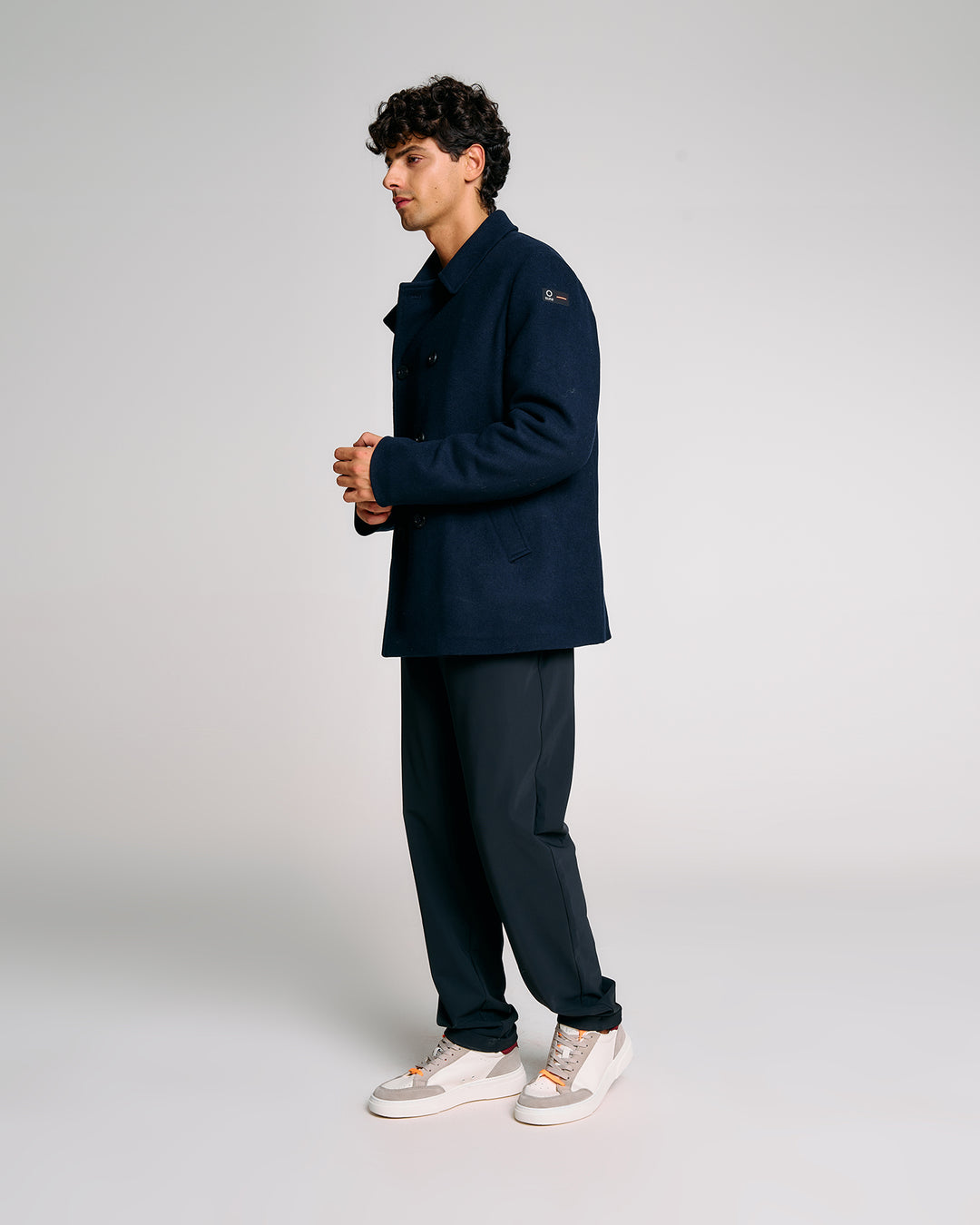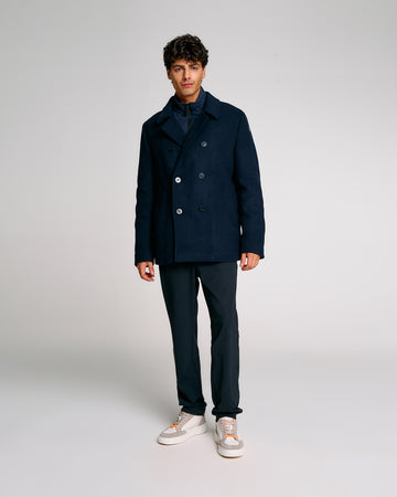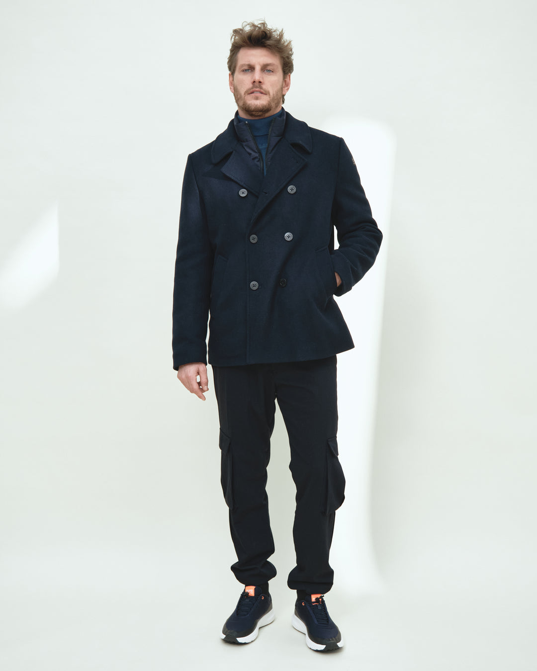 Una giacca doppiopetto da uomo che unisce eleganza classica e funzionalità moderna. Il design a doppio petto con bottoni a quattro fori valorizza lo stile formale del capo, mentre il taglio regolare e le tasche laterali a filetto ne sottolineano la praticità quotidiana. Il rivestimento in panno garantisce un look sofisticato, mentre l’interno trapuntato con leggera imbottitura offre un comfort termico adatto ai mesi più freschi.