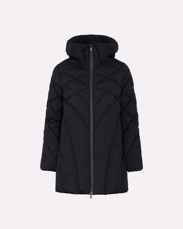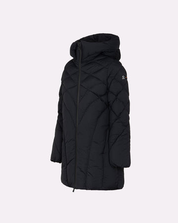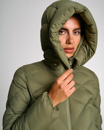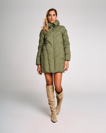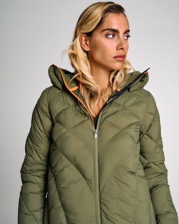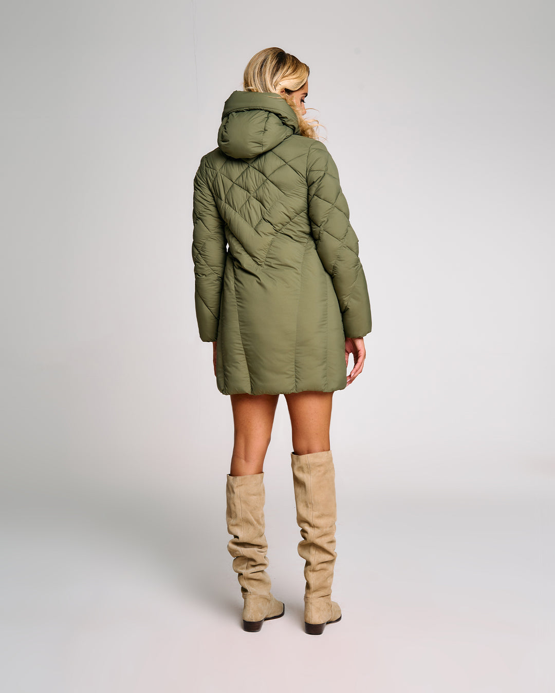 Questo giubbotto trapuntato da donna è pensato per offrire calore, protezione e stile nella stagione più fredda. Il design lungo e sagomato valorizza la silhouette senza rinunciare alla comodità. Il cappuccio fisso e la zip centrale con doppio cursore garantiscono massima funzionalità, mentre la trapuntatura a motivo geometrico aggiunge un tocco distintivo.
