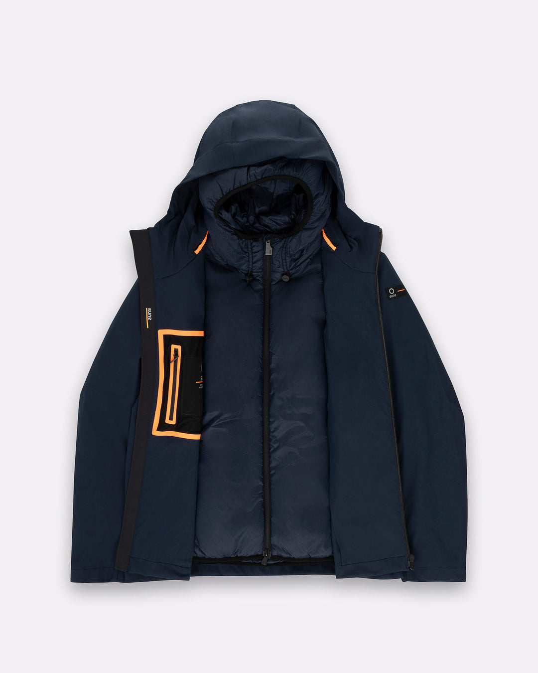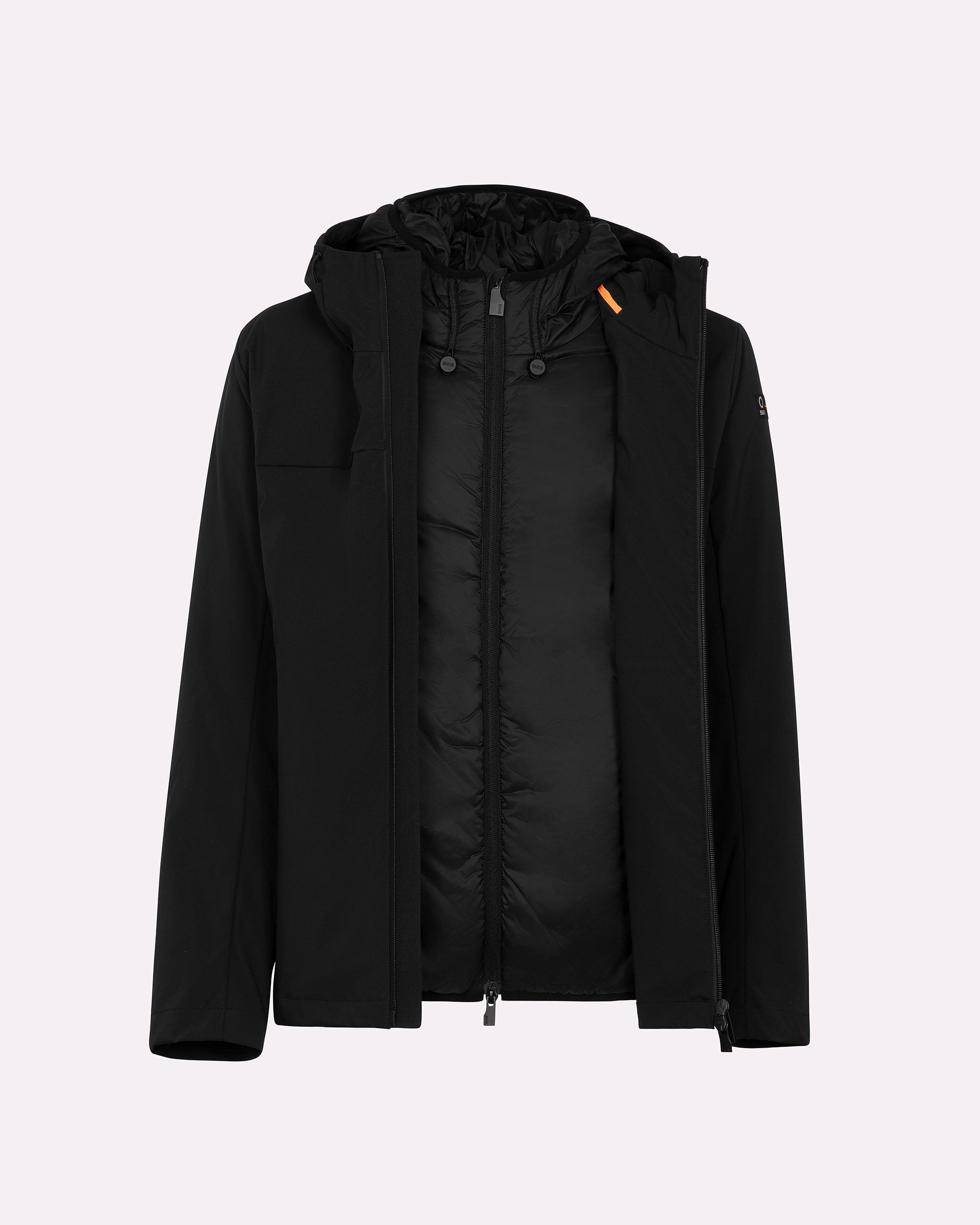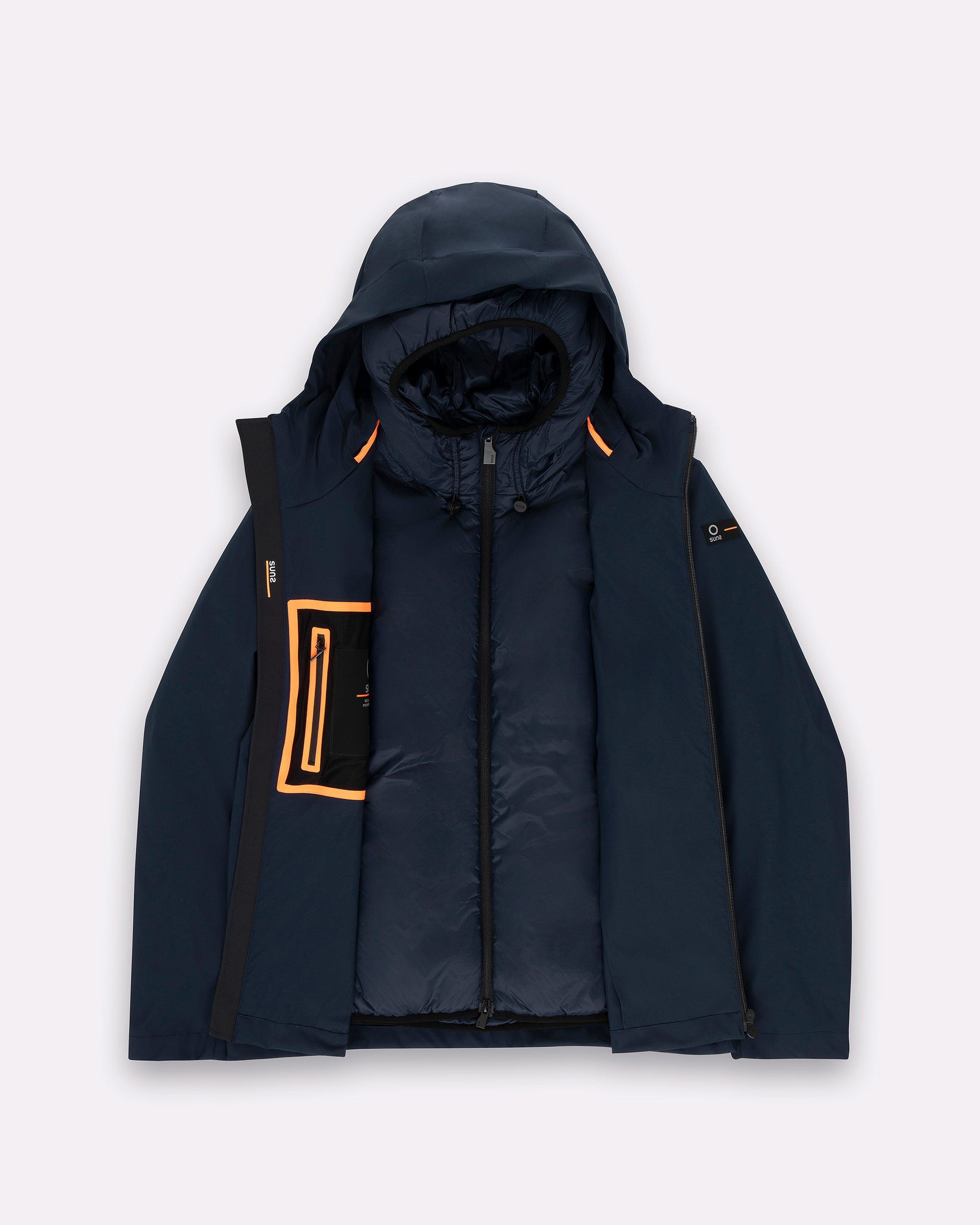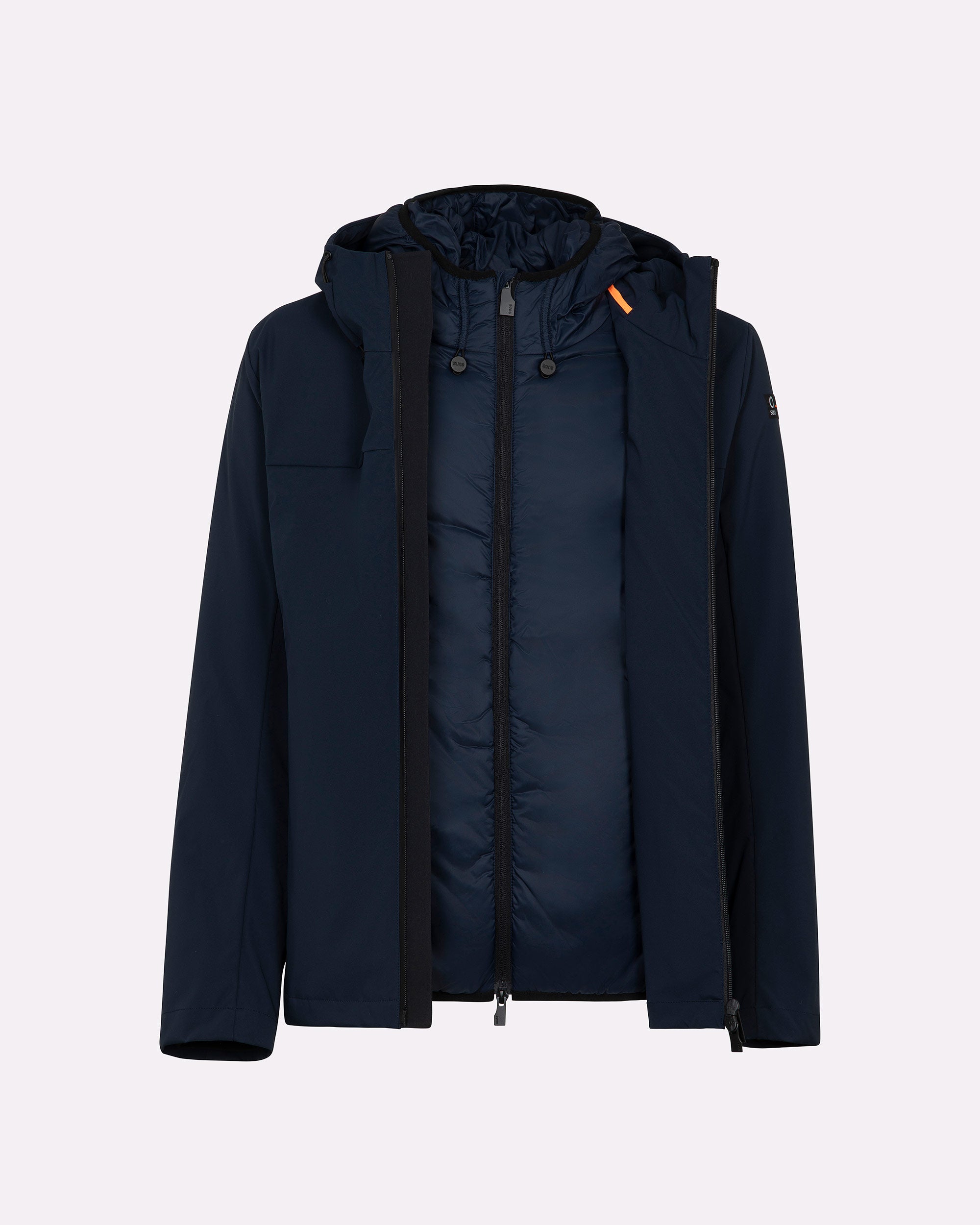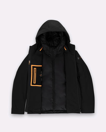 Un giubbotto tecnico da uomo estremamente versatile grazie alla struttura double layer componibile: due giubbini separati, staccabili e indossabili singolarmente o insieme. Il lato esterno, realizzato in tessuto tecnico con finitura termonastrata, è dotato di cappuccio regolabile con stopper personalizzati, tasche con zip e dettagli a contrasto arancione fluo. Il giubbino interno, più leggero, presenta imbottitura Thermolite 120gr, tasche laterali e chiusura zip con doppio cursore. Una soluzione perfetta per affrontare le diverse condizioni climatiche con stile e funzionalità.