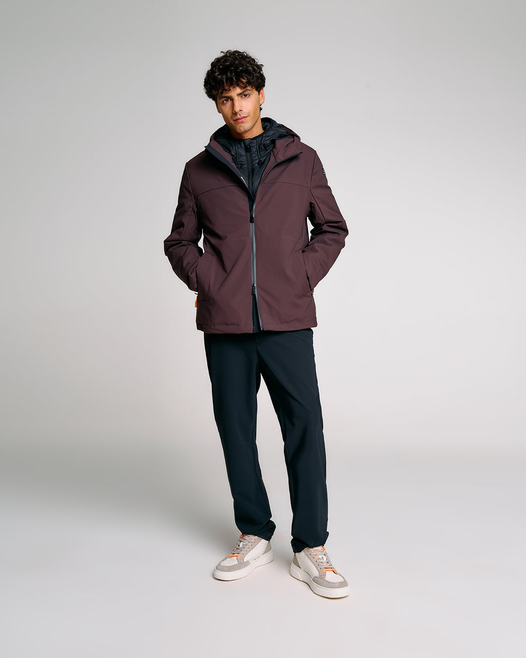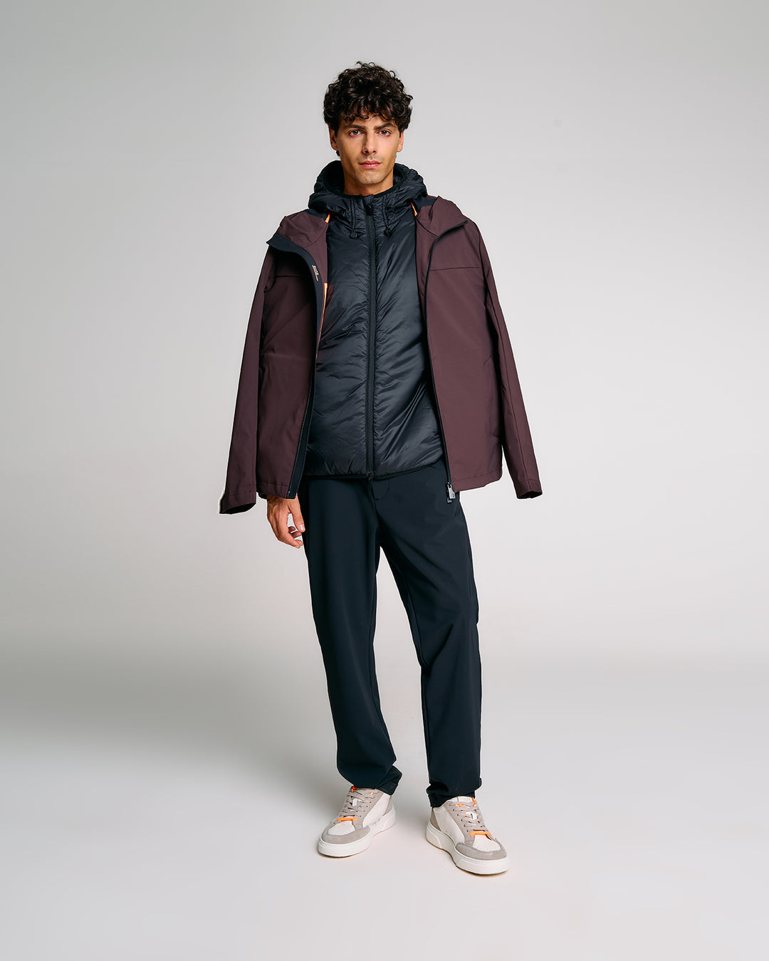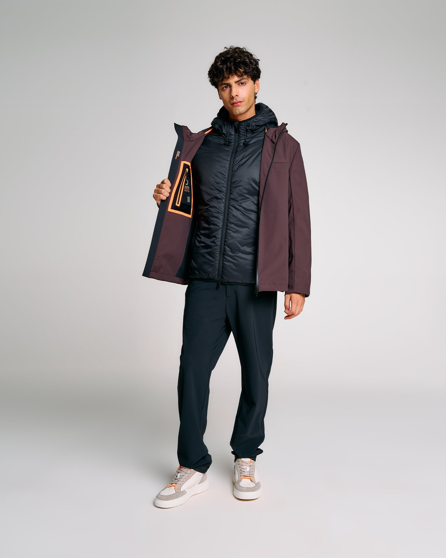 Un giubbotto tecnico da uomo estremamente versatile grazie alla struttura double layer componibile: due giubbini separati, staccabili e indossabili singolarmente o insieme. Il lato esterno, realizzato in tessuto tecnico con finitura termonastrata, è dotato di cappuccio regolabile con stopper personalizzati, tasche con zip e dettagli a contrasto arancione fluo. Il giubbino interno, più leggero, presenta imbottitura Thermolite 120gr, tasche laterali e chiusura zip con doppio cursore. Una soluzione perfetta per affrontare le diverse condizioni climatiche con stile e funzionalità.