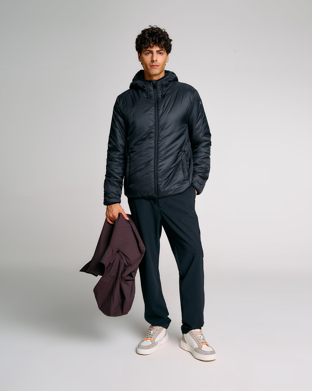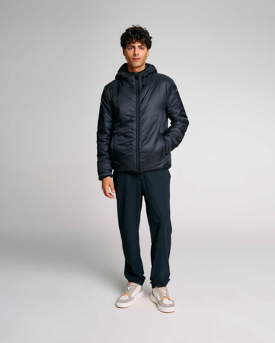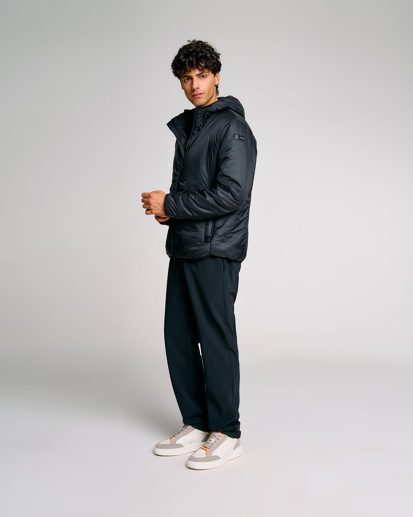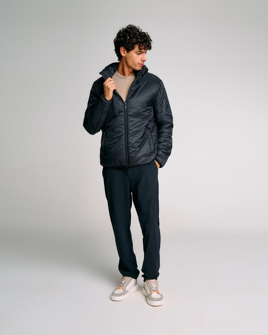 Un giubbotto tecnico da uomo estremamente versatile grazie alla struttura double layer componibile: due giubbini separati, staccabili e indossabili singolarmente o insieme. Il lato esterno, realizzato in tessuto tecnico con finitura termonastrata, è dotato di cappuccio regolabile con stopper personalizzati, tasche con zip e dettagli a contrasto arancione fluo. Il giubbino interno, più leggero, presenta imbottitura Thermolite 120gr, tasche laterali e chiusura zip con doppio cursore. Una soluzione perfetta per affrontare le diverse condizioni climatiche con stile e funzionalità.