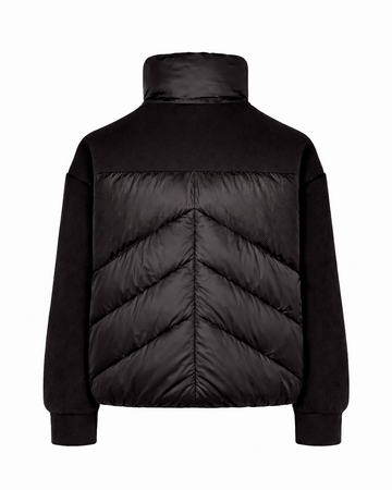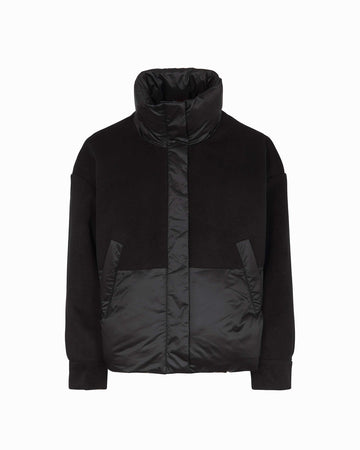 Un giubbotto donna con collo alto dal design moderno e minimale. La struttura ibrida unisce panno compatto e nylon trapuntato in un contrasto materico elegante e funzionale. Il collo alto imbottito assicura protezione dal freddo, mentre il taglio regolare valorizza la linea pulita del capo. Le tasche laterali sono pratiche e discrete, integrate in un modello pensato per uno stile urbano essenziale. La chiusura frontale coperta rifinisce il look con sobrietà tecnica.
