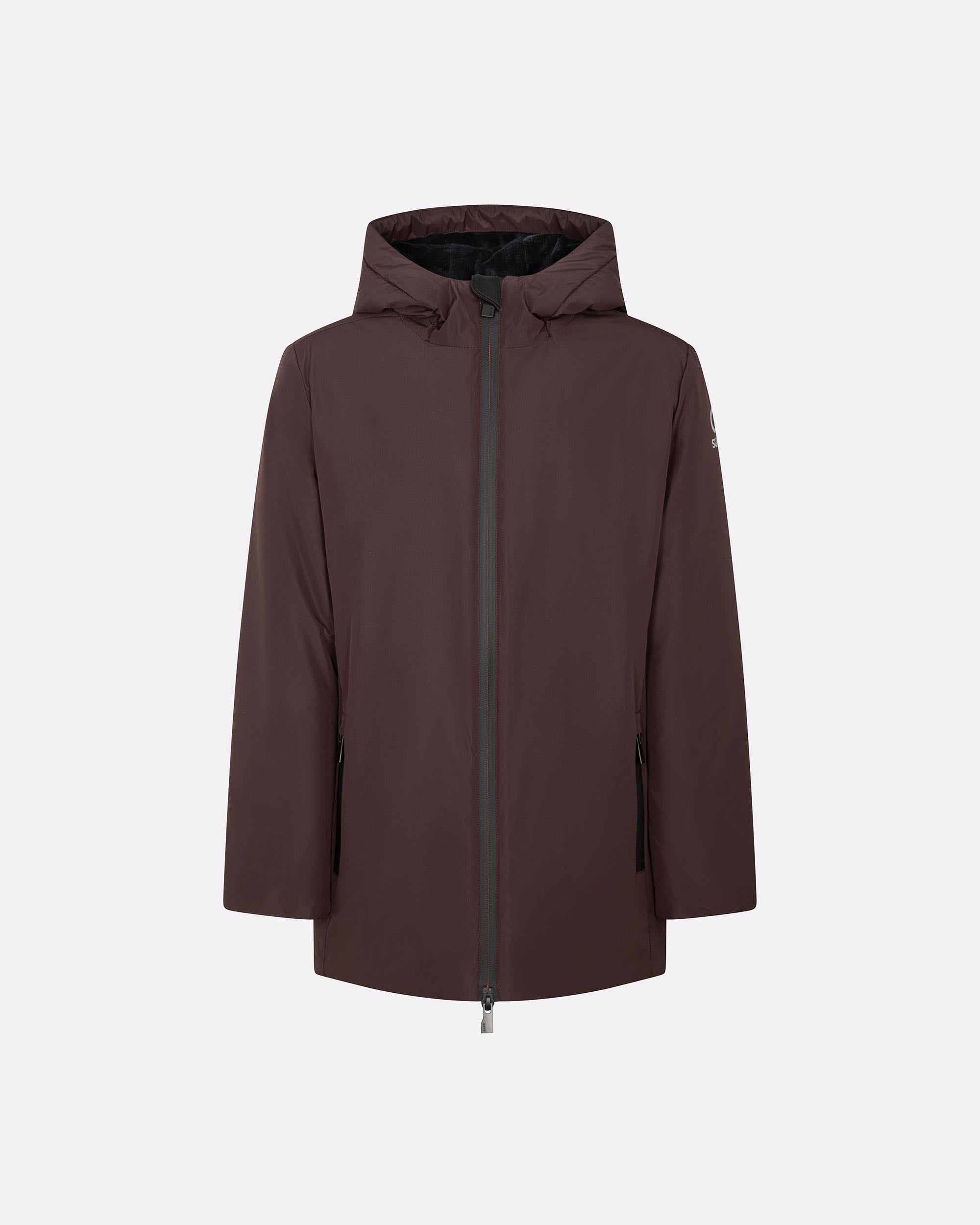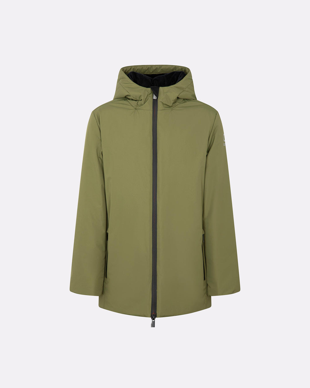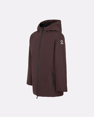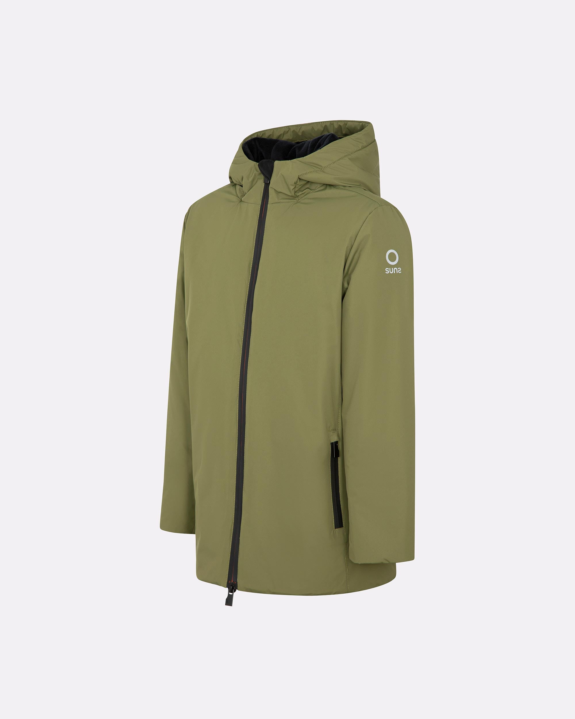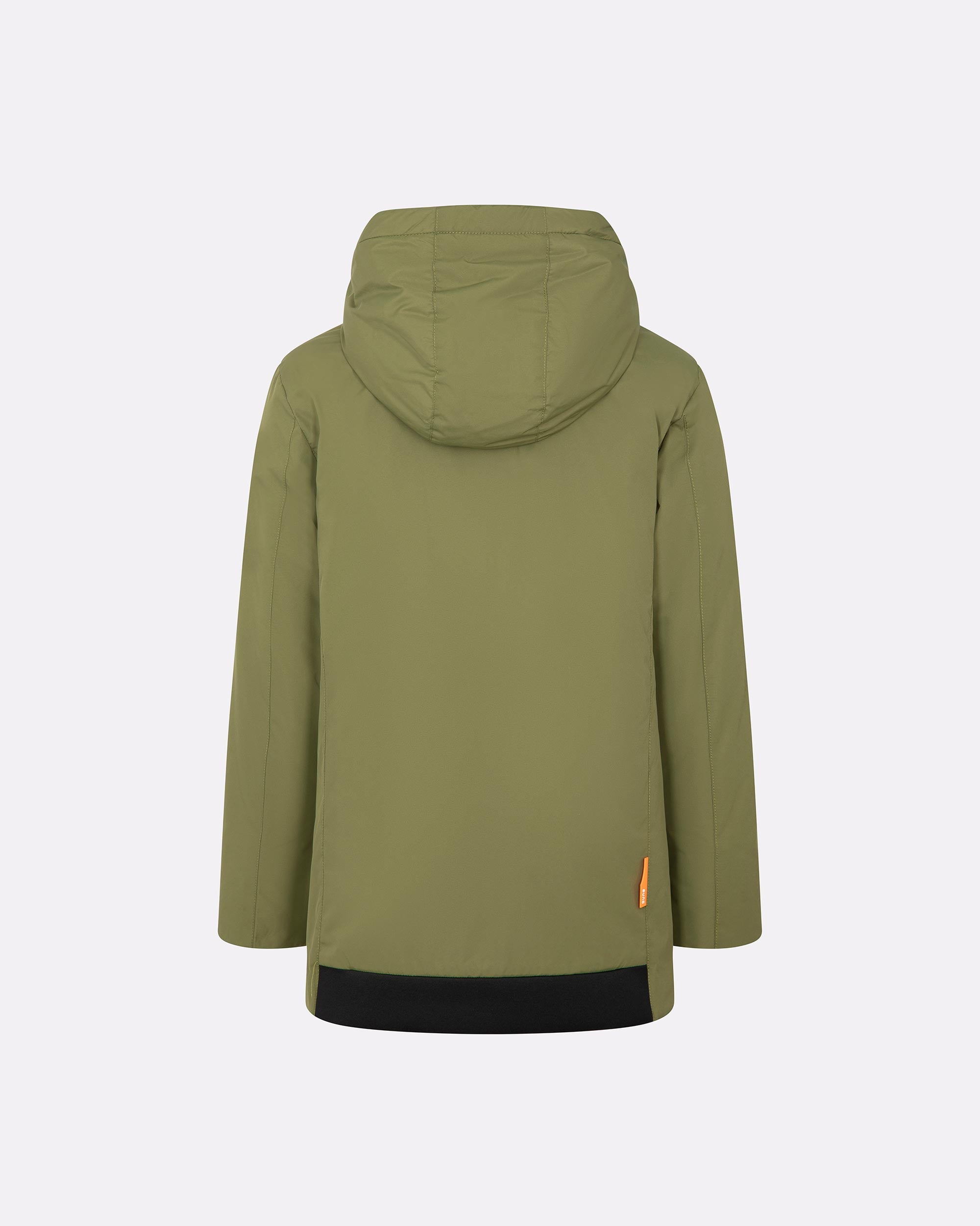Un giubbotto lungo da bambino pensato per garantire protezione e stile durante la stagione fredda. Il design essenziale è valorizzato dal cappuccio fisso e dalla chiusura frontale con zip nera a contrasto, mentre l'interno in eco fur rasata offre calore e comfort. Le tasche laterali con zip assicurano funzionalità quotidiana. Completano il look il logo reflective Suns sulla manica e la pinnetta arancione fluo sul fianco, segno distintivo del brand.