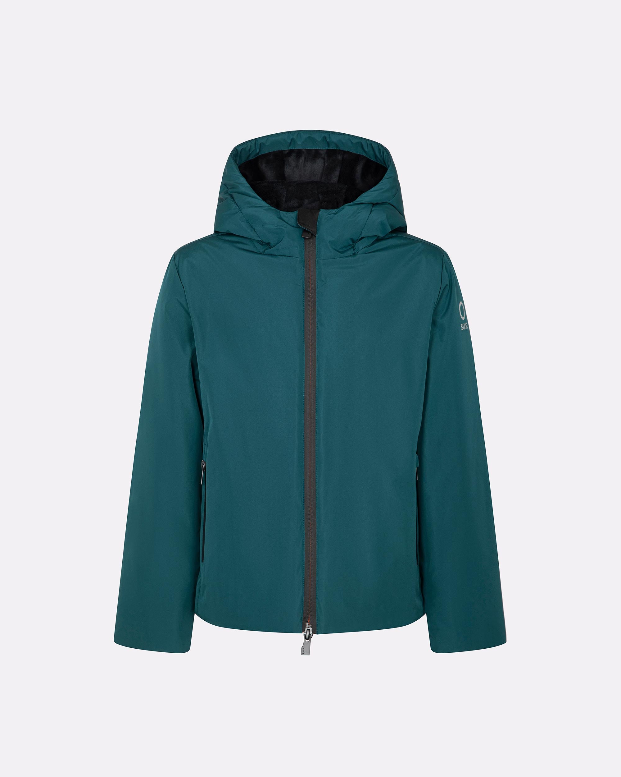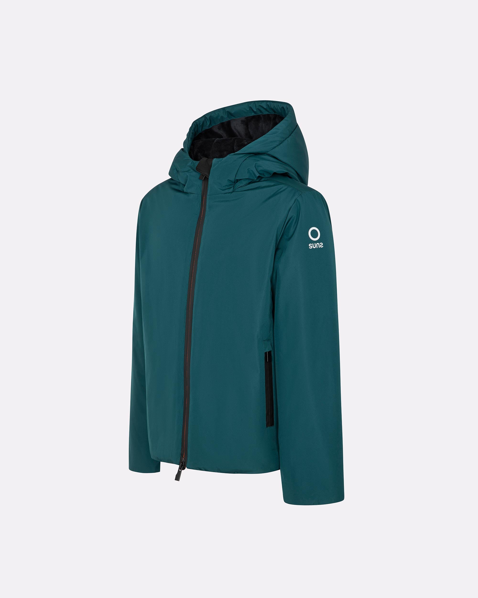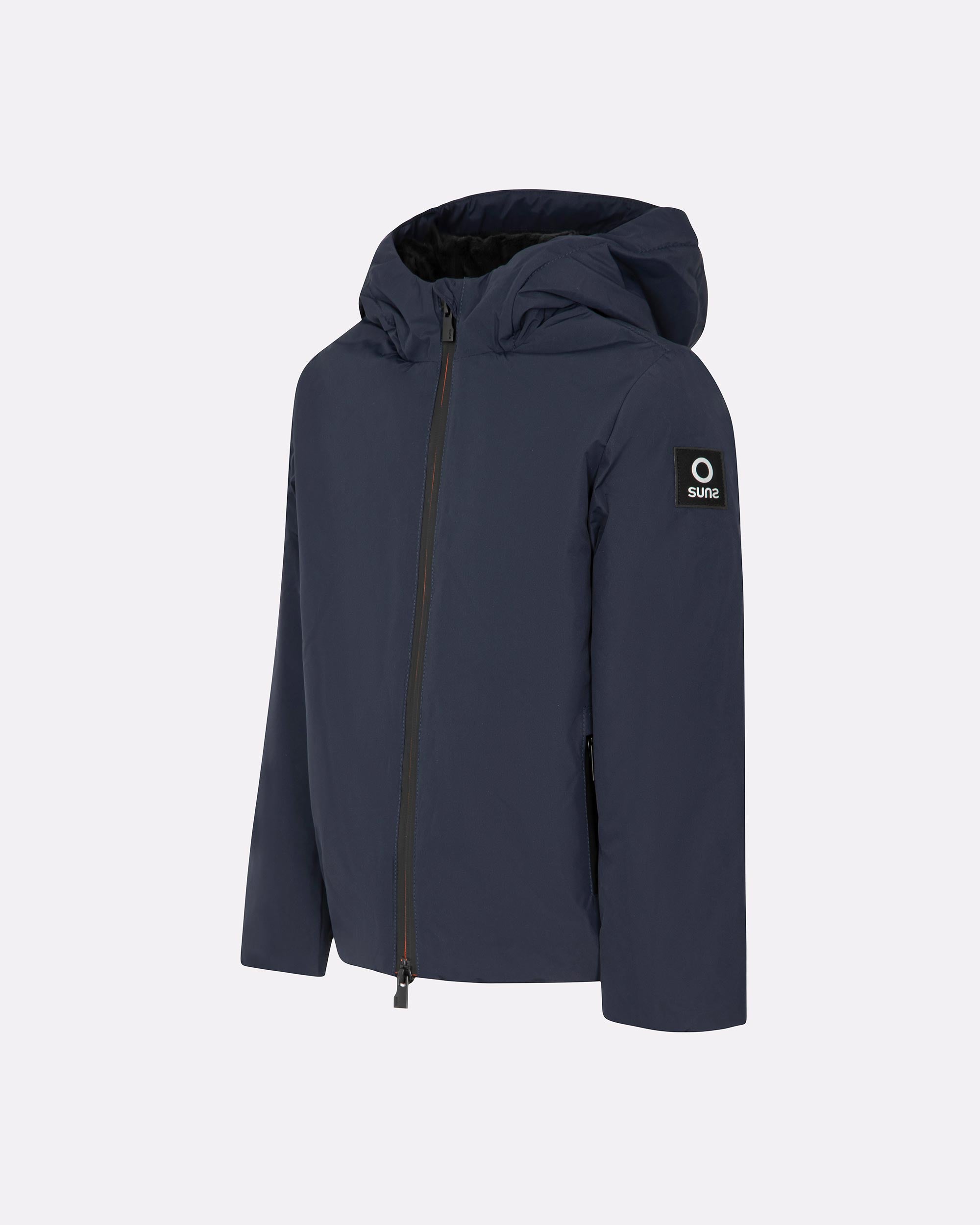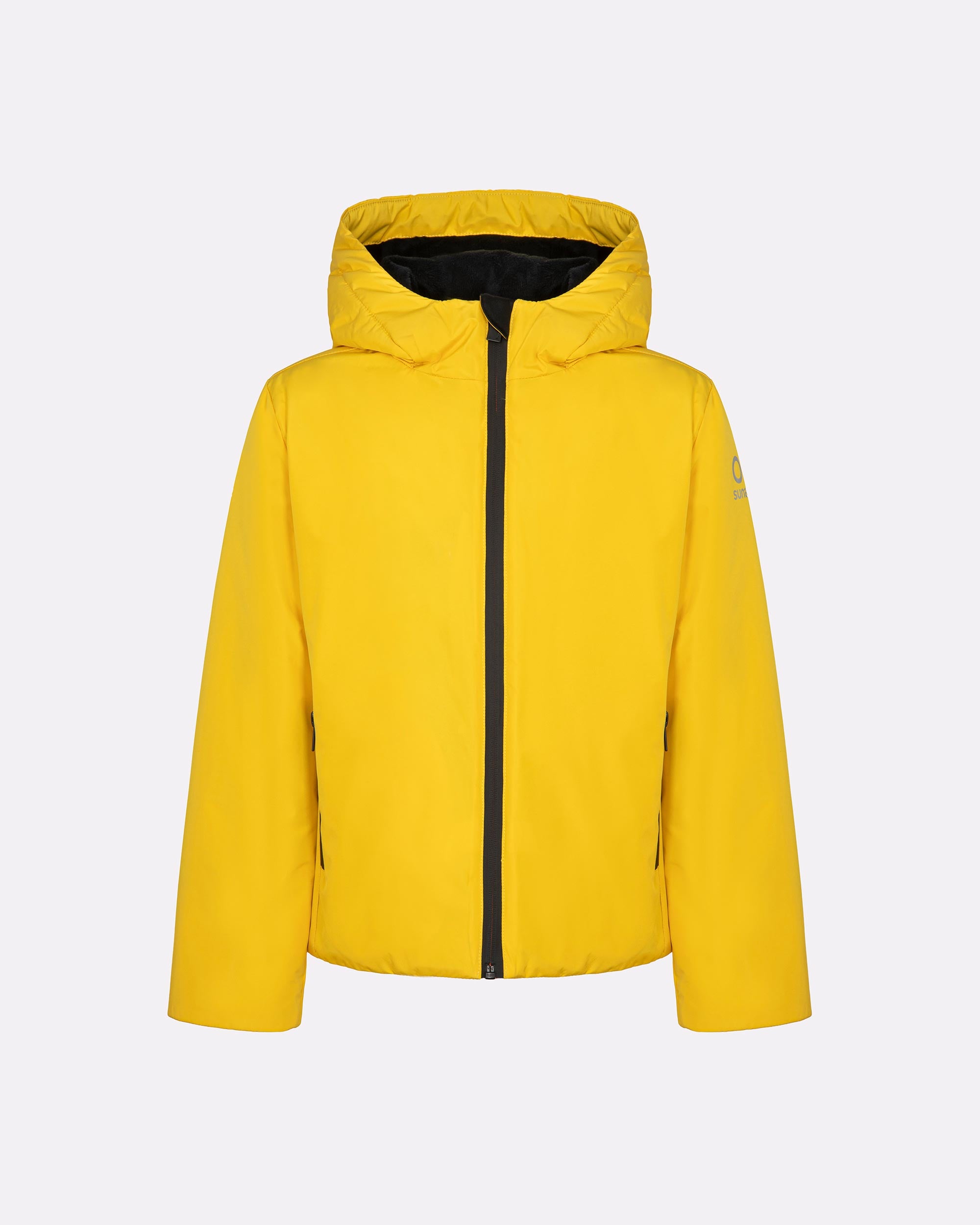 Un giubbotto da bambino dal design pulito e moderno, perfetto per affrontare la stagione fredda con comfort e stile. Il modello presenta cappuccio fisso e una zip frontale waterproof a contrasto, abbinata alle tasche laterali con zip termosaldata. L'interno è interamente rivestito in eco fur rasata, per offrire calore e morbidezza. Il retro è caratterizzato da un fondo in tessuto a contrasto che aggiunge un dettaglio grafico distintivo. Completano il look il logo reflective Suns sulla manica sinistra e la classica pinnetta arancione fluo sul fianco destro.