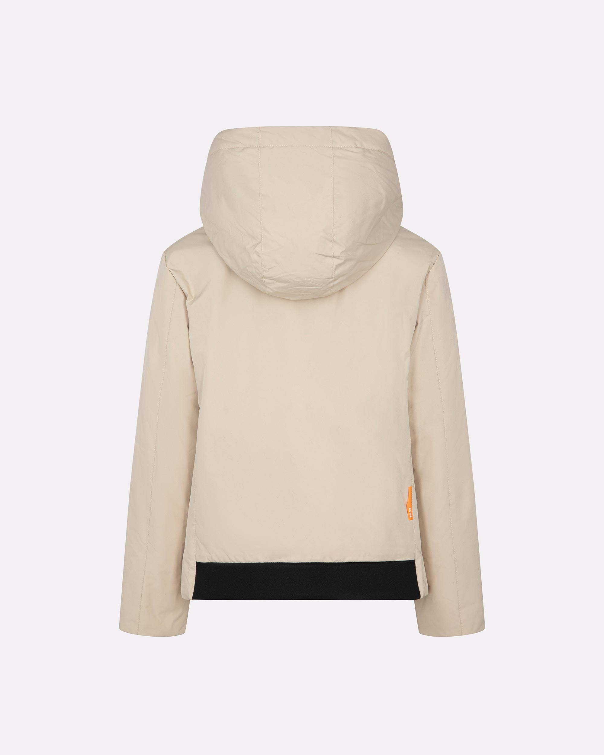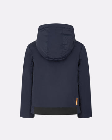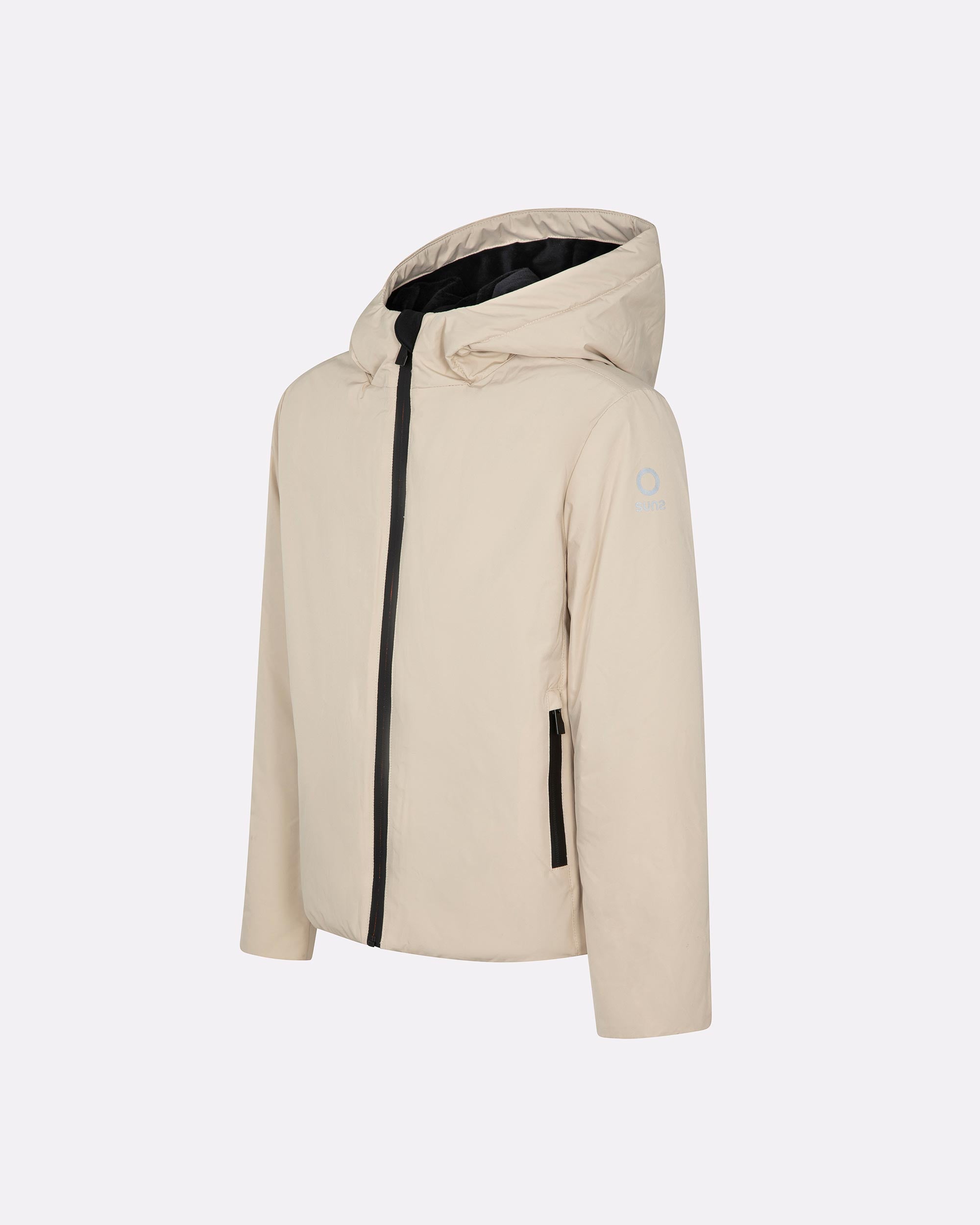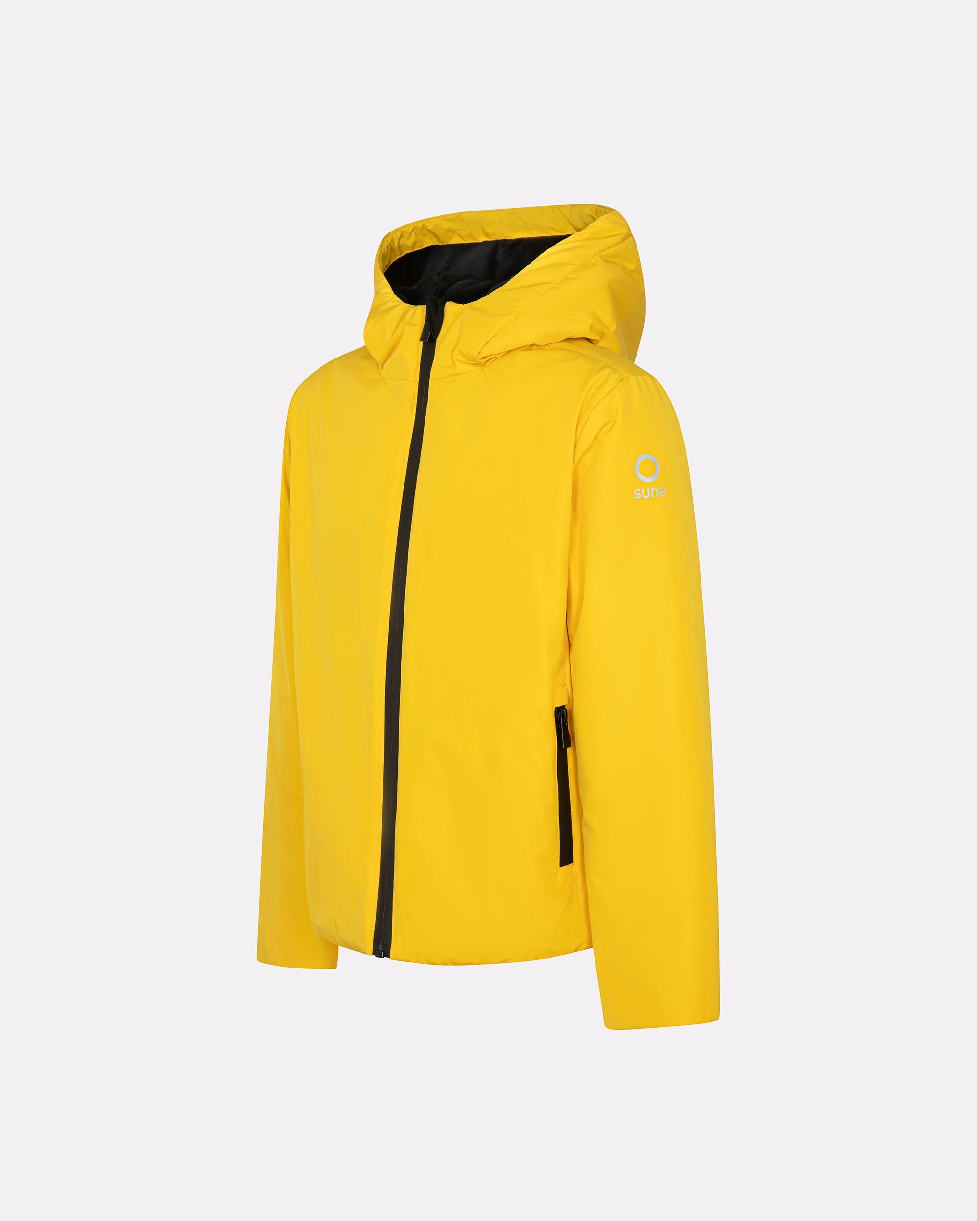 Un giubbotto da bambino dal design pulito e moderno, perfetto per affrontare la stagione fredda con comfort e stile. Il modello presenta cappuccio fisso e una zip frontale waterproof a contrasto, abbinata alle tasche laterali con zip termosaldata. L'interno è interamente rivestito in eco fur rasata, per offrire calore e morbidezza. Il retro è caratterizzato da un fondo in tessuto a contrasto che aggiunge un dettaglio grafico distintivo. Completano il look il logo reflective Suns sulla manica sinistra e la classica pinnetta arancione fluo sul fianco destro.
