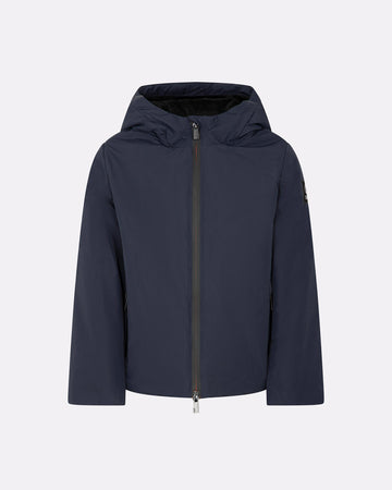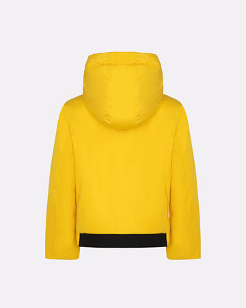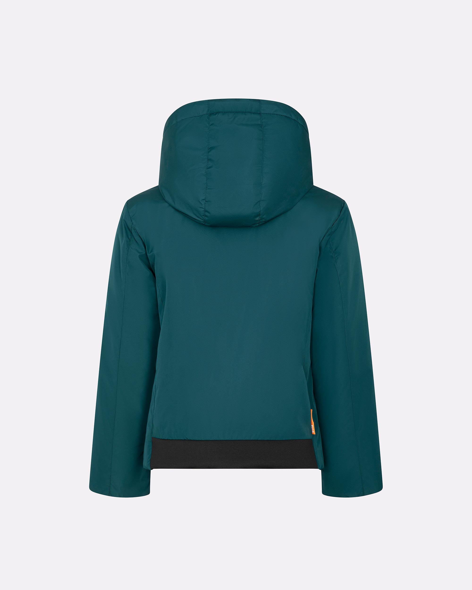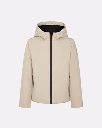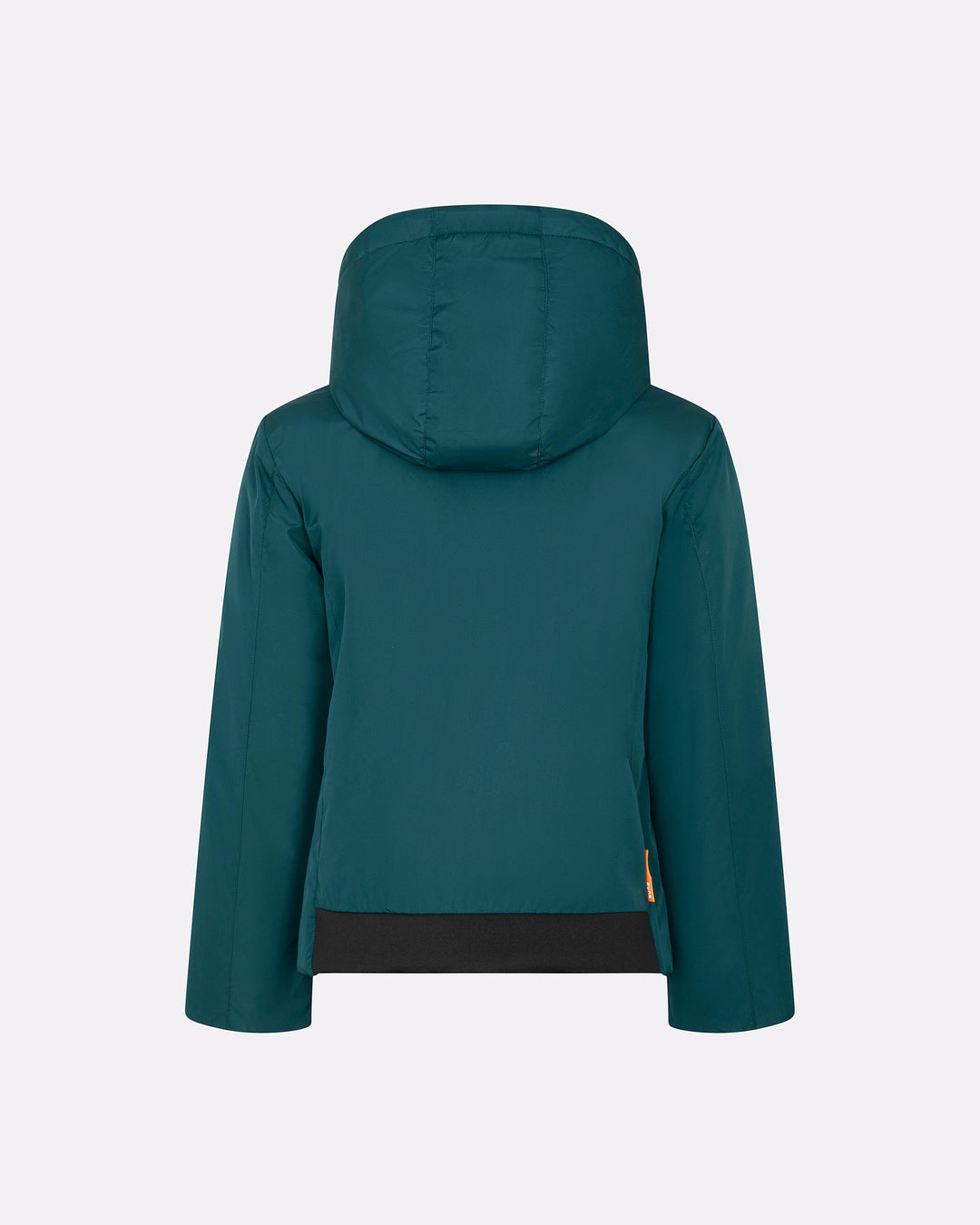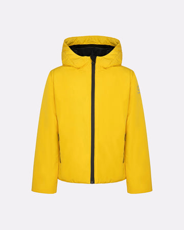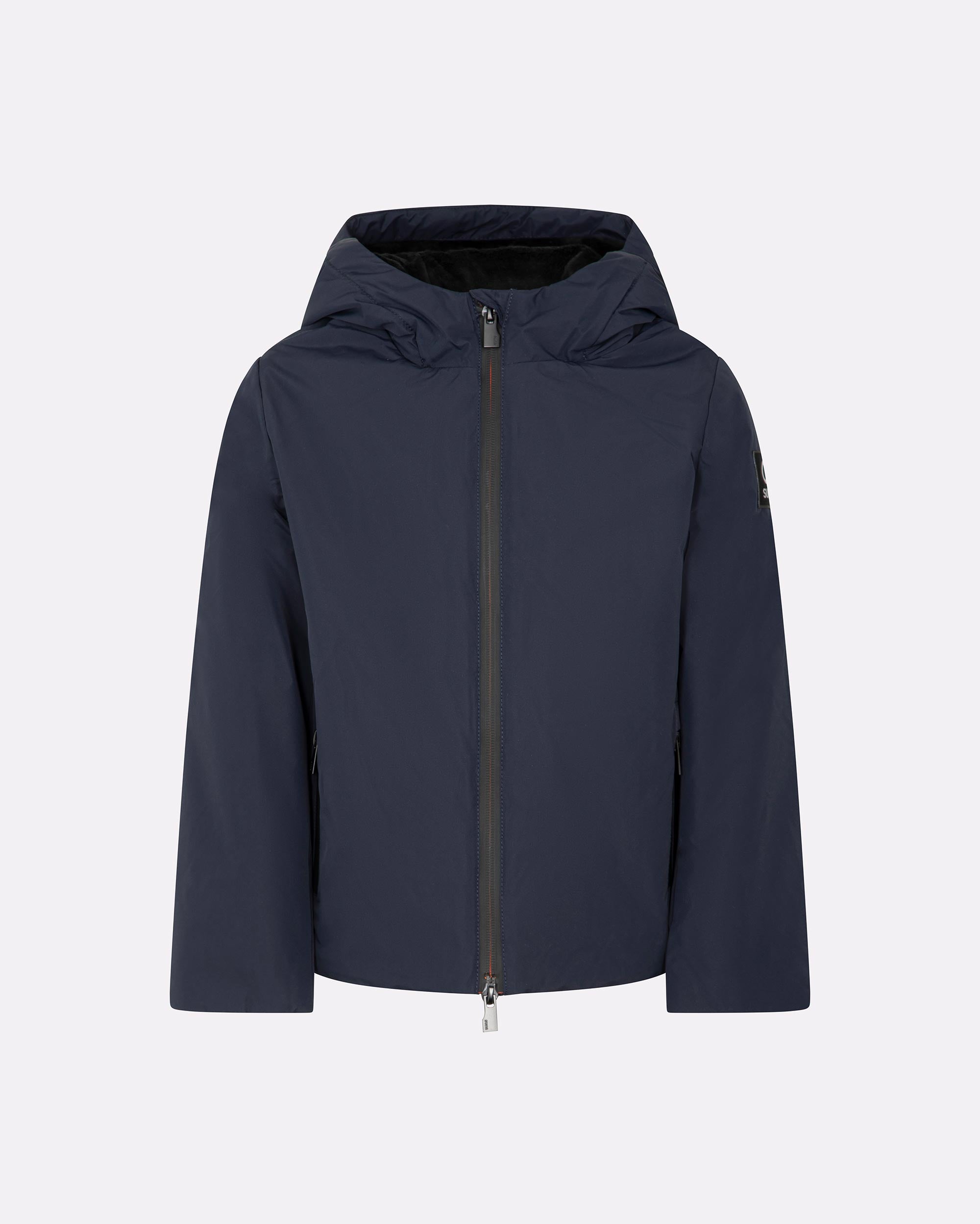 Un giubbotto da bambino dal design pulito e moderno, perfetto per affrontare la stagione fredda con comfort e stile. Il modello presenta cappuccio fisso e una zip frontale waterproof a contrasto, abbinata alle tasche laterali con zip termosaldata. L'interno è interamente rivestito in eco fur rasata, per offrire calore e morbidezza. Il retro è caratterizzato da un fondo in tessuto a contrasto che aggiunge un dettaglio grafico distintivo. Completano il look il logo reflective Suns sulla manica sinistra e la classica pinnetta arancione fluo sul fianco destro.