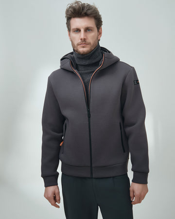 Questa felpa con cappuccio da uomo combina funzionalità e stile minimale. Realizzata in un tessuto tecnico confortevole, offre una sensazione avvolgente ma leggera, perfetta per l'uso quotidiano. Il design pulito è valorizzato dal cappuccio fisso strutturato e dalla zip frontale a doppio cursore, mentre le tasche laterali con zip termosaldata aggiungono praticità mantenendo un look essenziale. Il dettaglio del logo Suns in rilievo sulla manica conferisce un tocco distintivo, discreto ma riconoscibile.