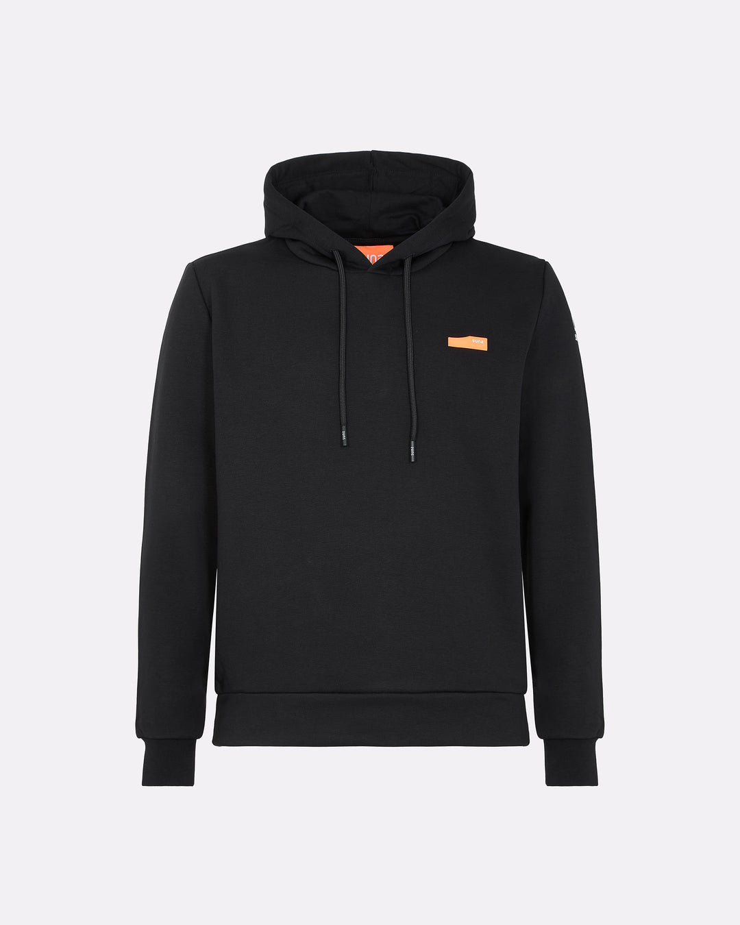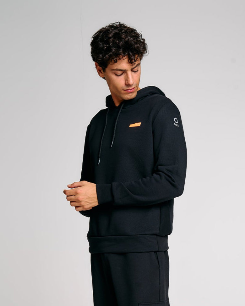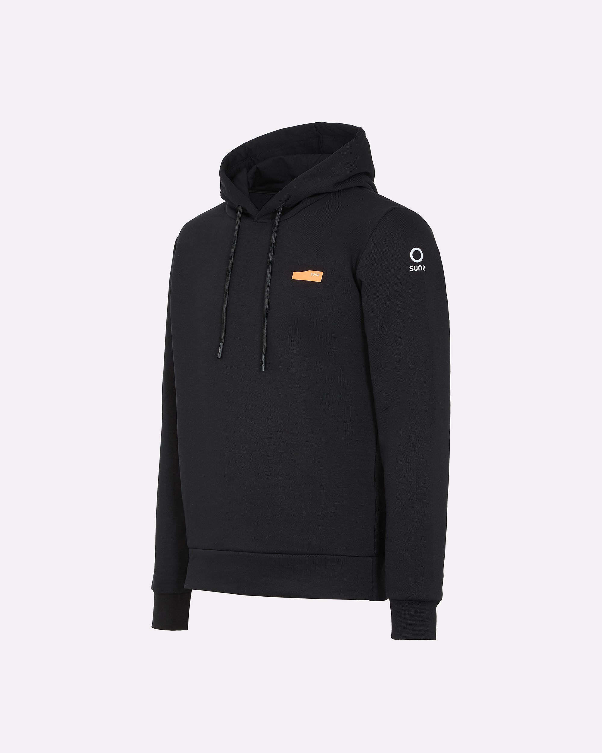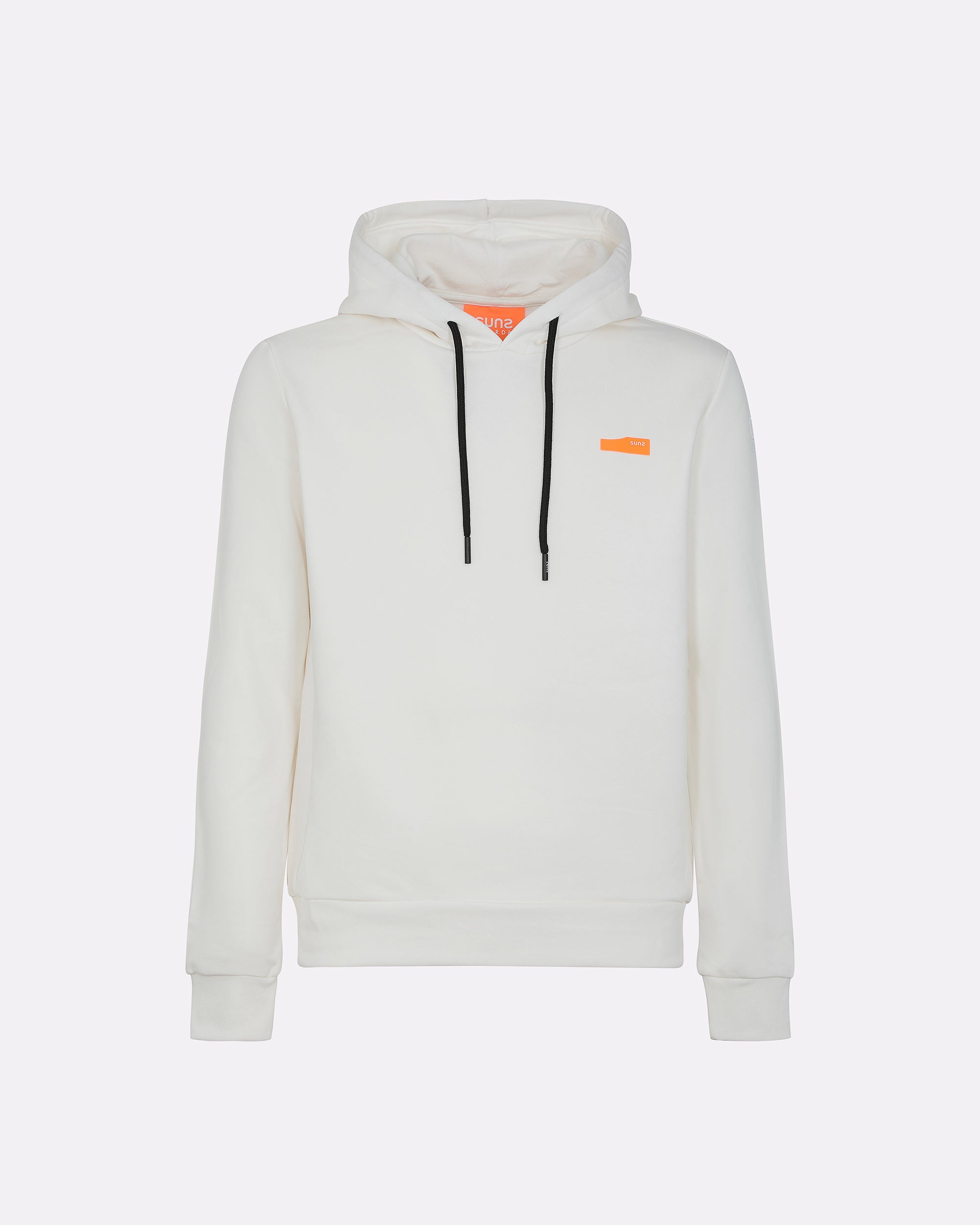 Una felpa con cappuccio da uomo pensata per chi cerca praticità, comfort e identità visiva. Realizzata in felpa diagonale in cotone elasticizzato, è dotata di cappuccio regolabile con coulisse e interni in jersey tono su tono. La costruzione prevede pannelli laterali in costina che migliorano la vestibilità, e finiture in rib al fondo e ai polsi. La stampa spessorata frontale aggiunge un tocco grafico distintivo, valorizzato dal logo reflective Suns sulla manica e dalla pinnetta arancione fluo, elemento distintivo del brand Suns, sempre posizionata sul fianco lato destro.