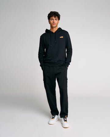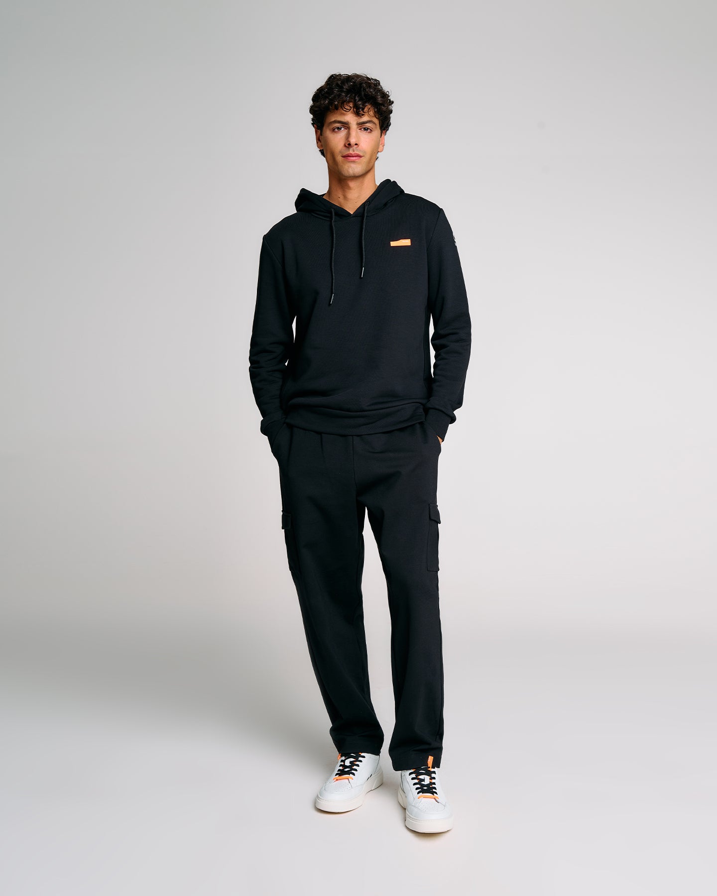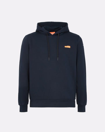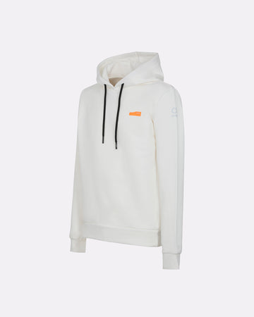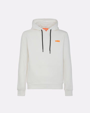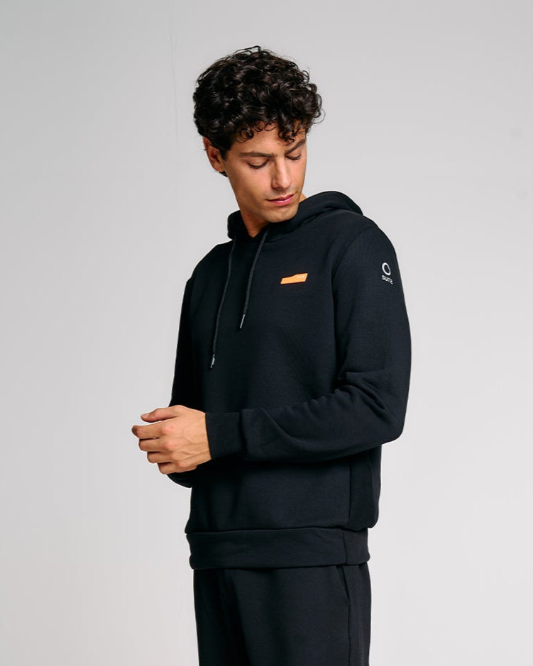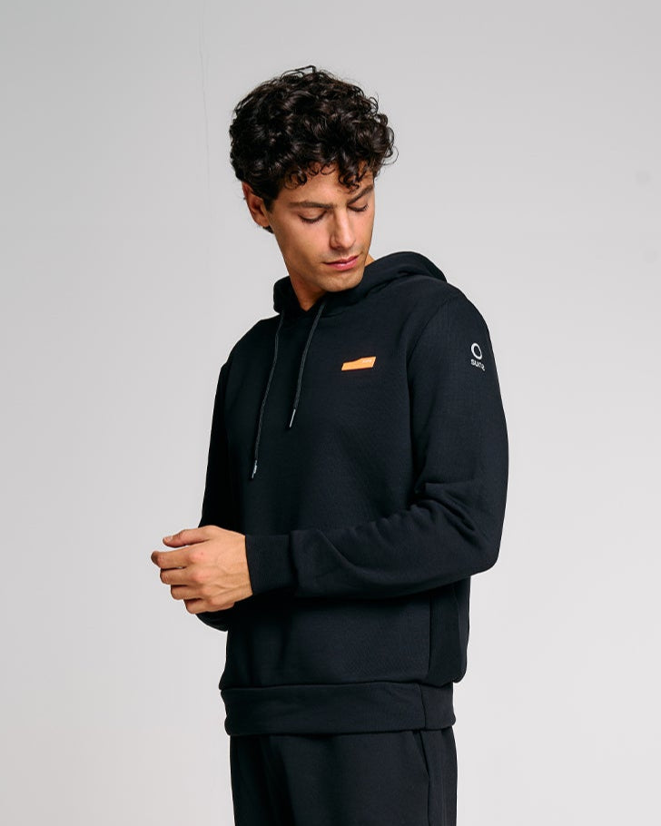 Una felpa con cappuccio da uomo pensata per chi cerca praticità, comfort e identità visiva. Realizzata in felpa diagonale in cotone elasticizzato, è dotata di cappuccio regolabile con coulisse e interni in jersey tono su tono. La costruzione prevede pannelli laterali in costina che migliorano la vestibilità, e finiture in rib al fondo e ai polsi. La stampa spessorata frontale aggiunge un tocco grafico distintivo, valorizzato dal logo reflective Suns sulla manica e dalla pinnetta arancione fluo, elemento distintivo del brand Suns, sempre posizionata sul fianco lato destro.