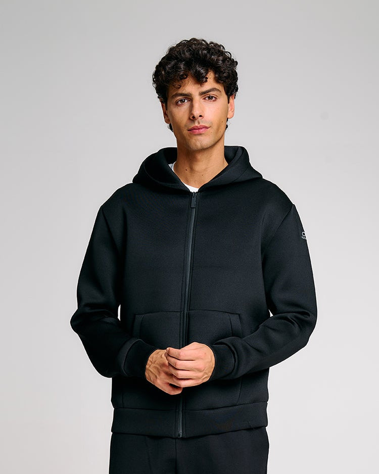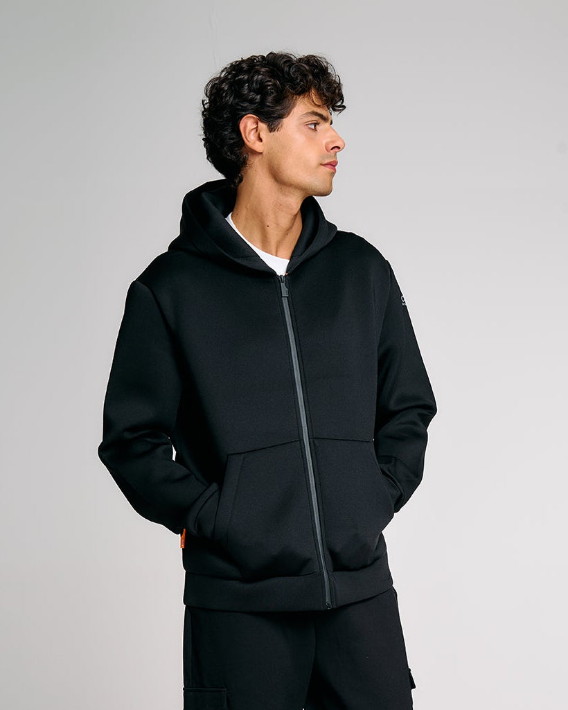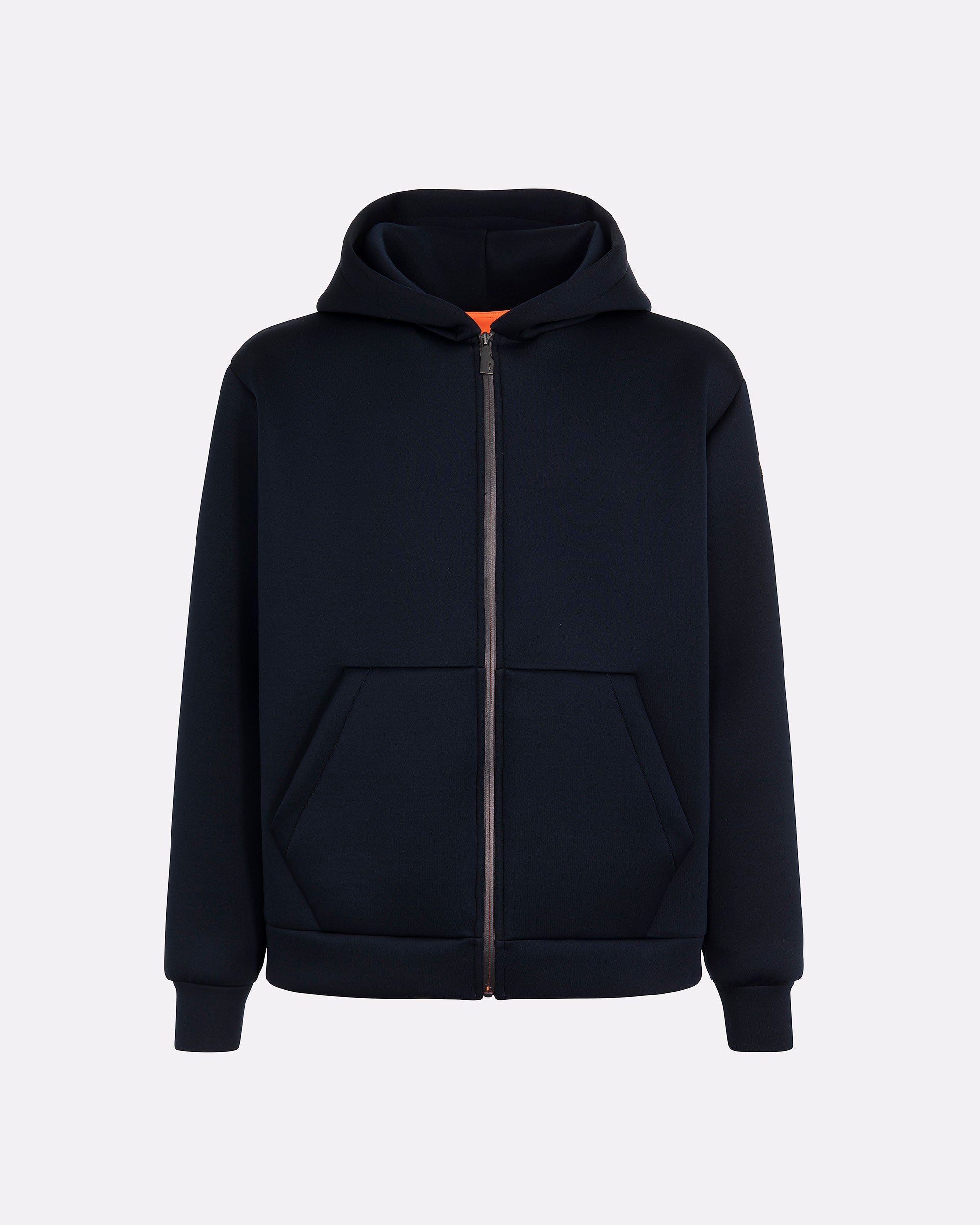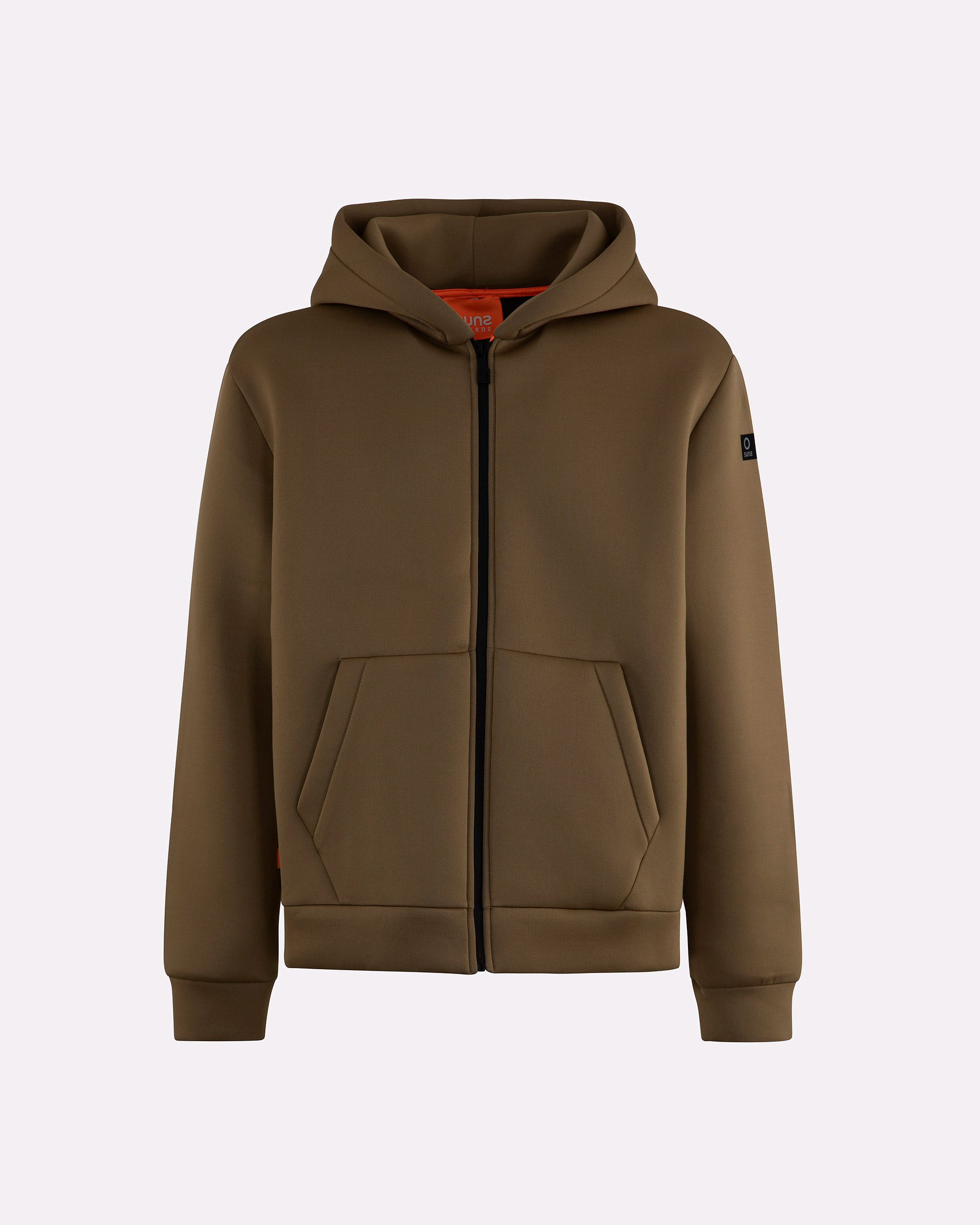 Felpa da uomo con cappuccio dal design funzionale e contemporaneo. Il modello presenta una struttura ergonomica con lavorazione speciale su spalle e fianchi che migliora comfort e mobilità. Il tessuto tecnico compatto garantisce una tenuta strutturata e un look deciso, ideale per affrontare la quotidianità con stile. La chiusura frontale con zip waterproof nera si abbina perfettamente al design pulito, mentre la tasca marsupio anteriore aggiunge praticità. Completano il capo il cappuccio regolabile, il parasudore arancione fluo interno e la pinnetta arancio in silicone come dettaglio firmato Suns.
