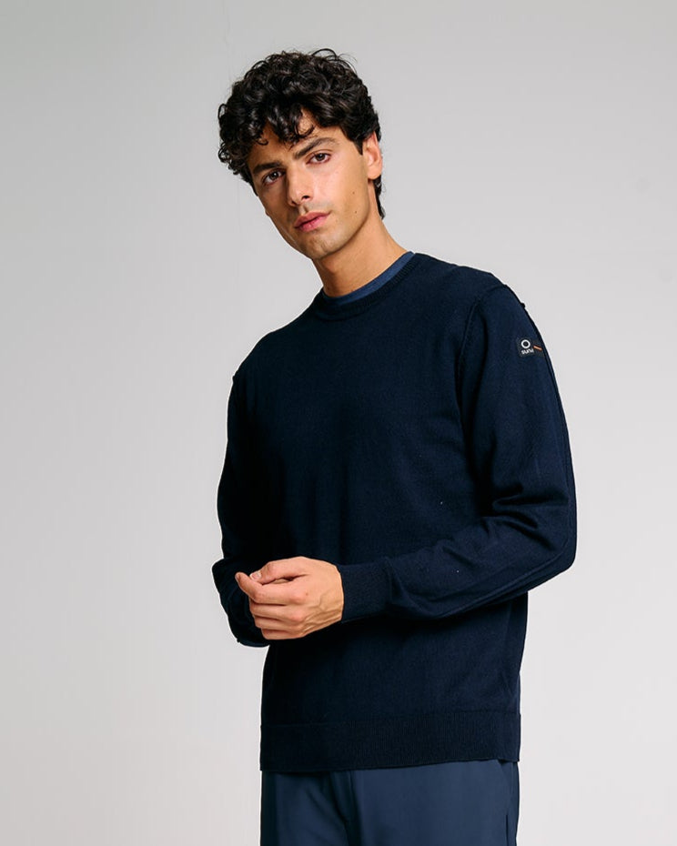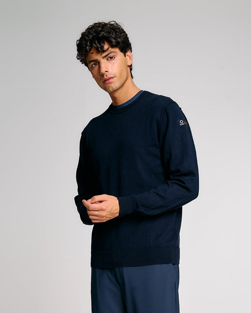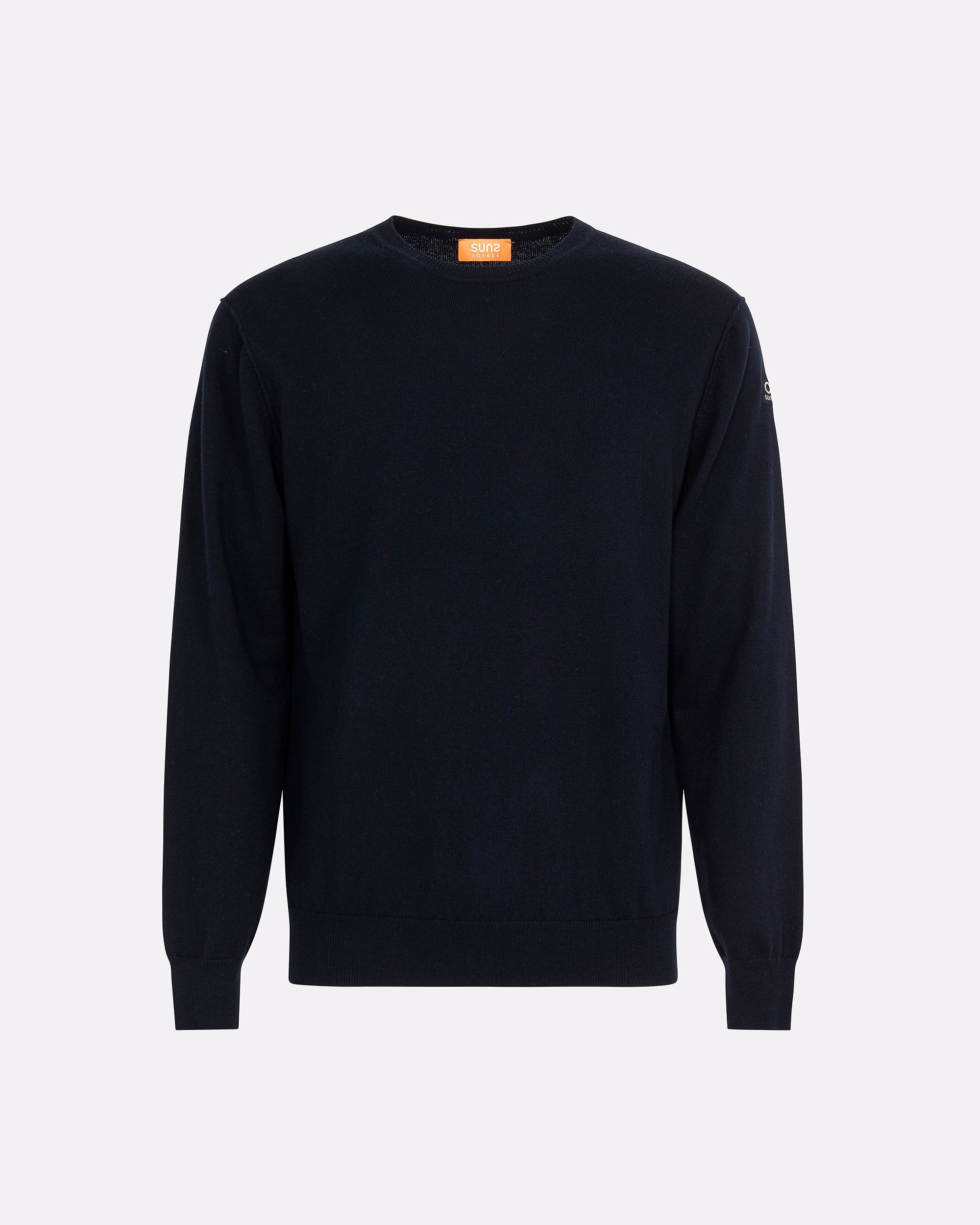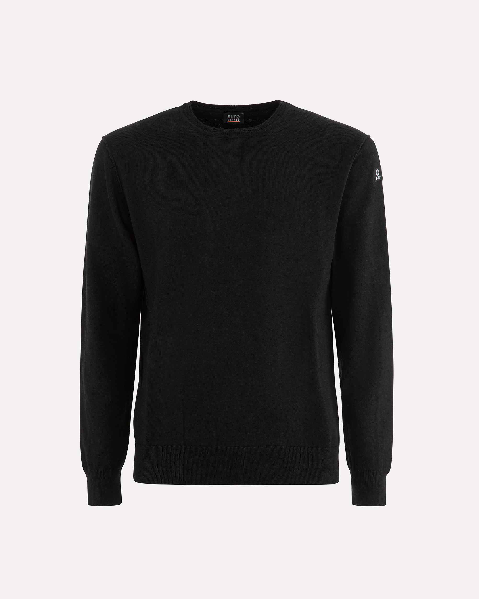 Un maglione girocollo da uomo dal design lineare e sofisticato, perfetto per un look casual ma curato. Realizzato in morbido cotone con una piccola percentuale di lana, questo modello presenta una struttura sagomata visibile nei punti di costruzione, per un tocco tecnico ed elegante. Il bordo vita, il fondo manica e il collo sono rifiniti a costine, per una vestibilità precisa e confortevole. Il logo Suns in patch nera è applicato sulla manica sinistra.