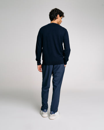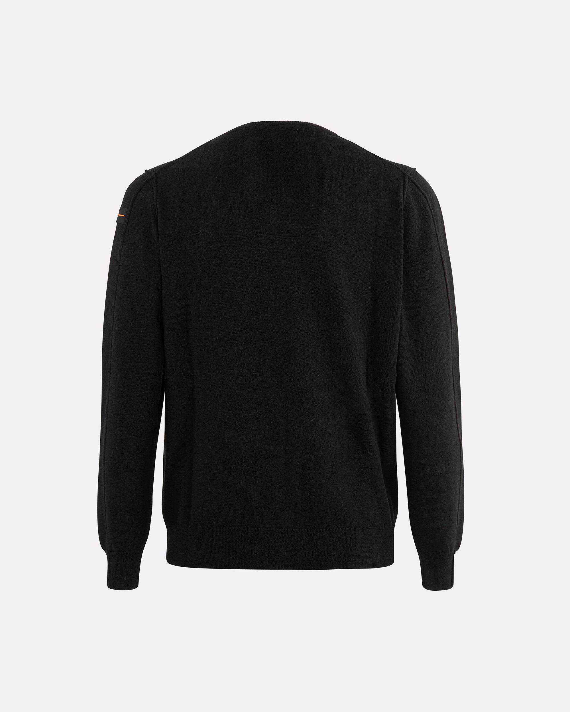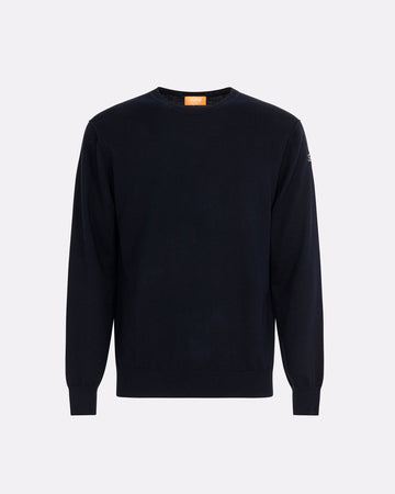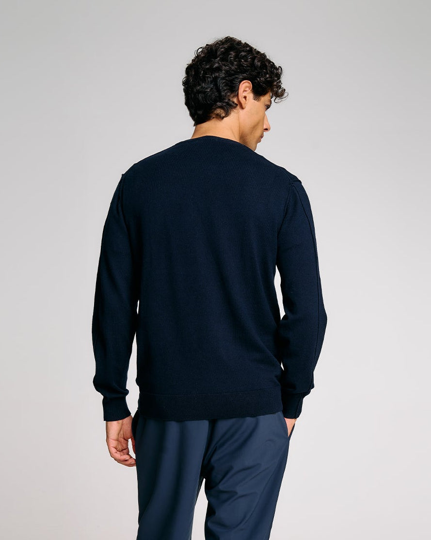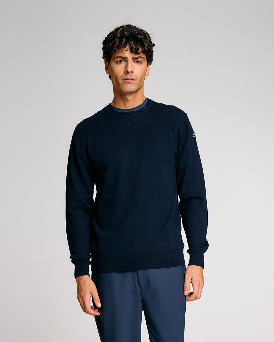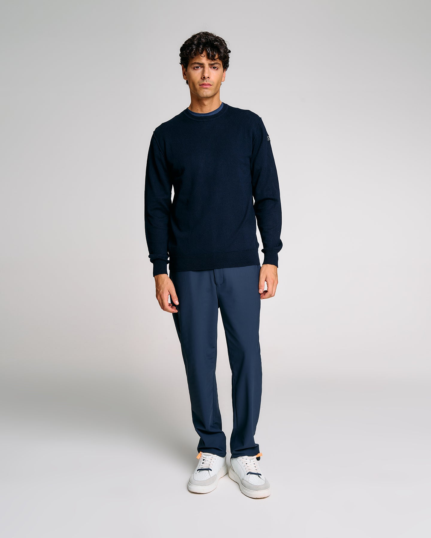 Un maglione girocollo da uomo dal design lineare e sofisticato, perfetto per un look casual ma curato. Realizzato in morbido cotone con una piccola percentuale di lana, questo modello presenta una struttura sagomata visibile nei punti di costruzione, per un tocco tecnico ed elegante. Il bordo vita, il fondo manica e il collo sono rifiniti a costine, per una vestibilità precisa e confortevole. Il logo Suns in patch nera è applicato sulla manica sinistra.