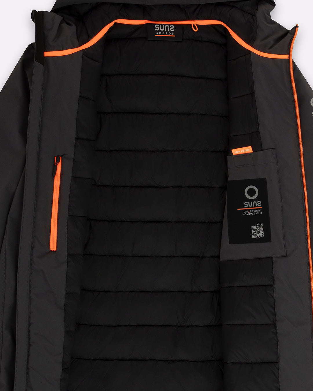• Zip bicolore waterproof: funzionalità elevata con interno a contrasto arancione.