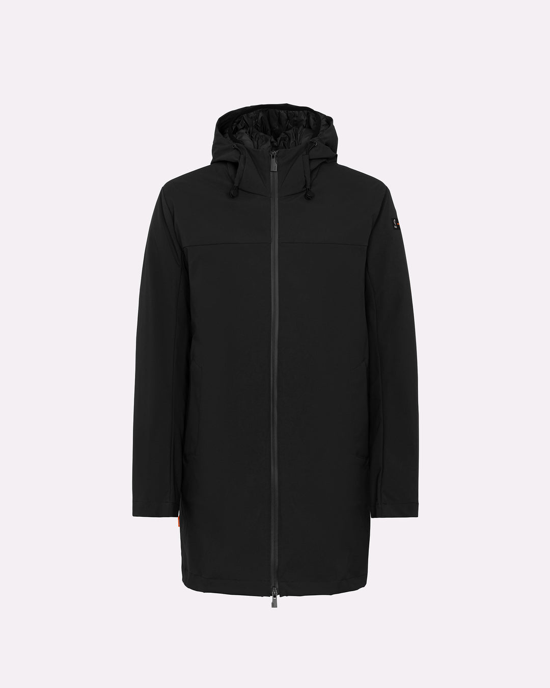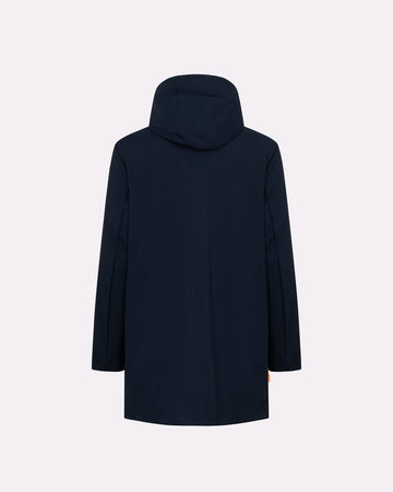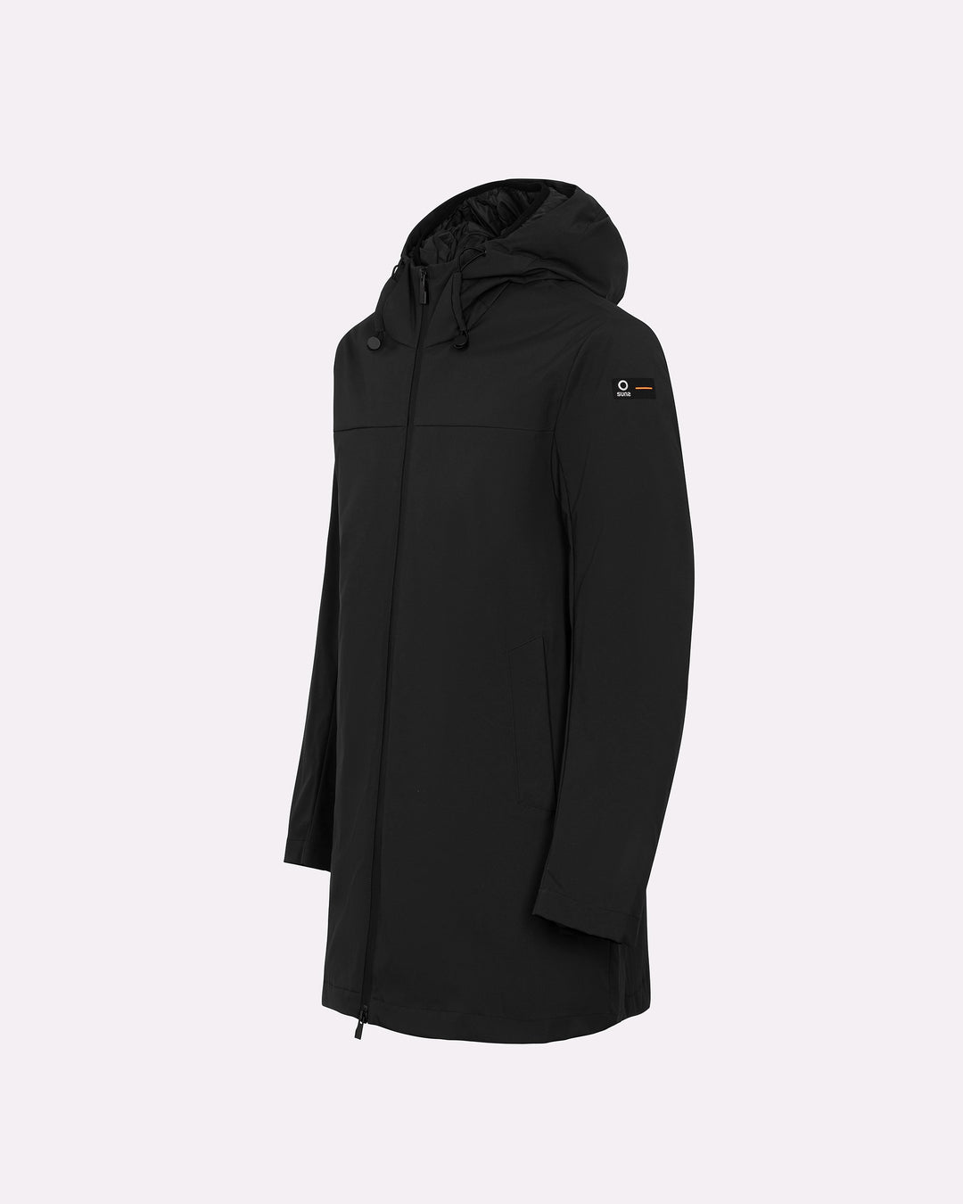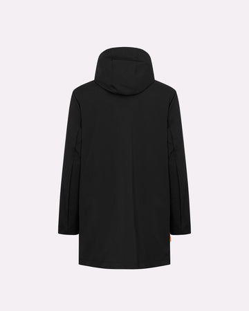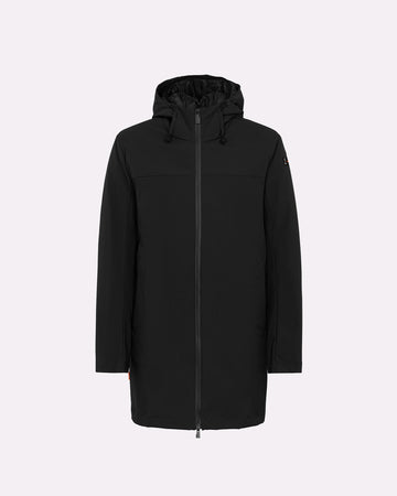 Esterno lungo in tessuto tecnico: look minimal e protezione avanzata.