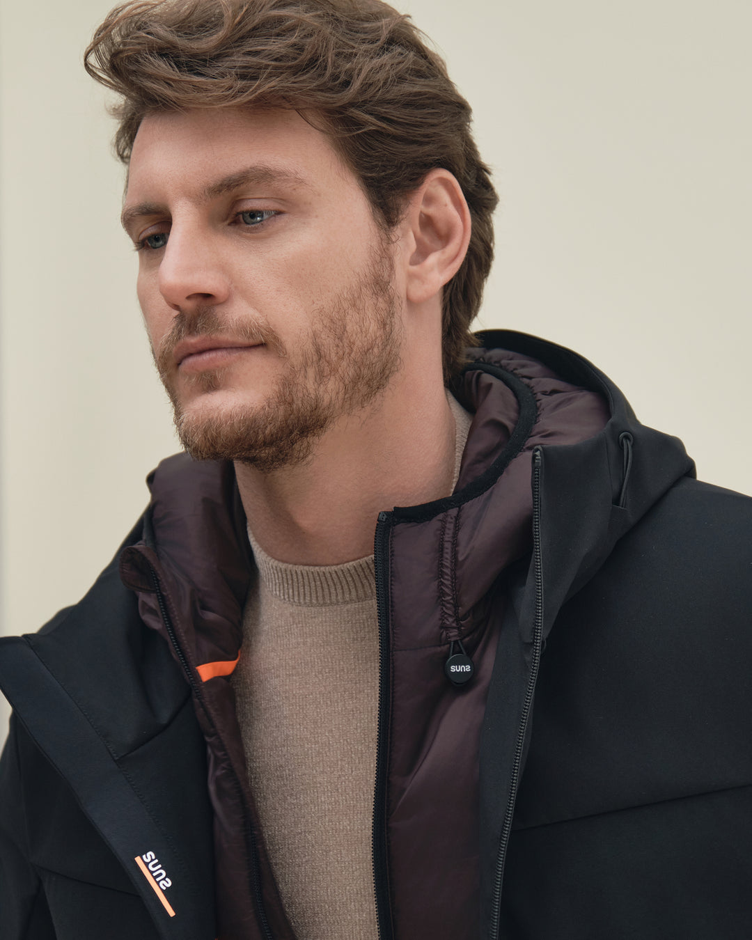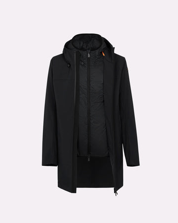 Un giubbotto da uomo pensato per offrire massima versatilità e protezione in ogni condizione. Il modello è composto da due giubbini separati, staccabili e componibili, da indossare insieme o singolarmente in base al clima e allo stile desiderato. Il primo strato esterno, in tessuto tecnico, ha un design più lungo con linee pulite e moderne; il secondo, più compatto e imbottito, presenta un look sportivo ed essenziale. Entrambi sono dotati di cappuccio regolabile con coulisse, zip waterproof e dettagli termo incollati per una protezione ottimale dagli agenti atmosferici.