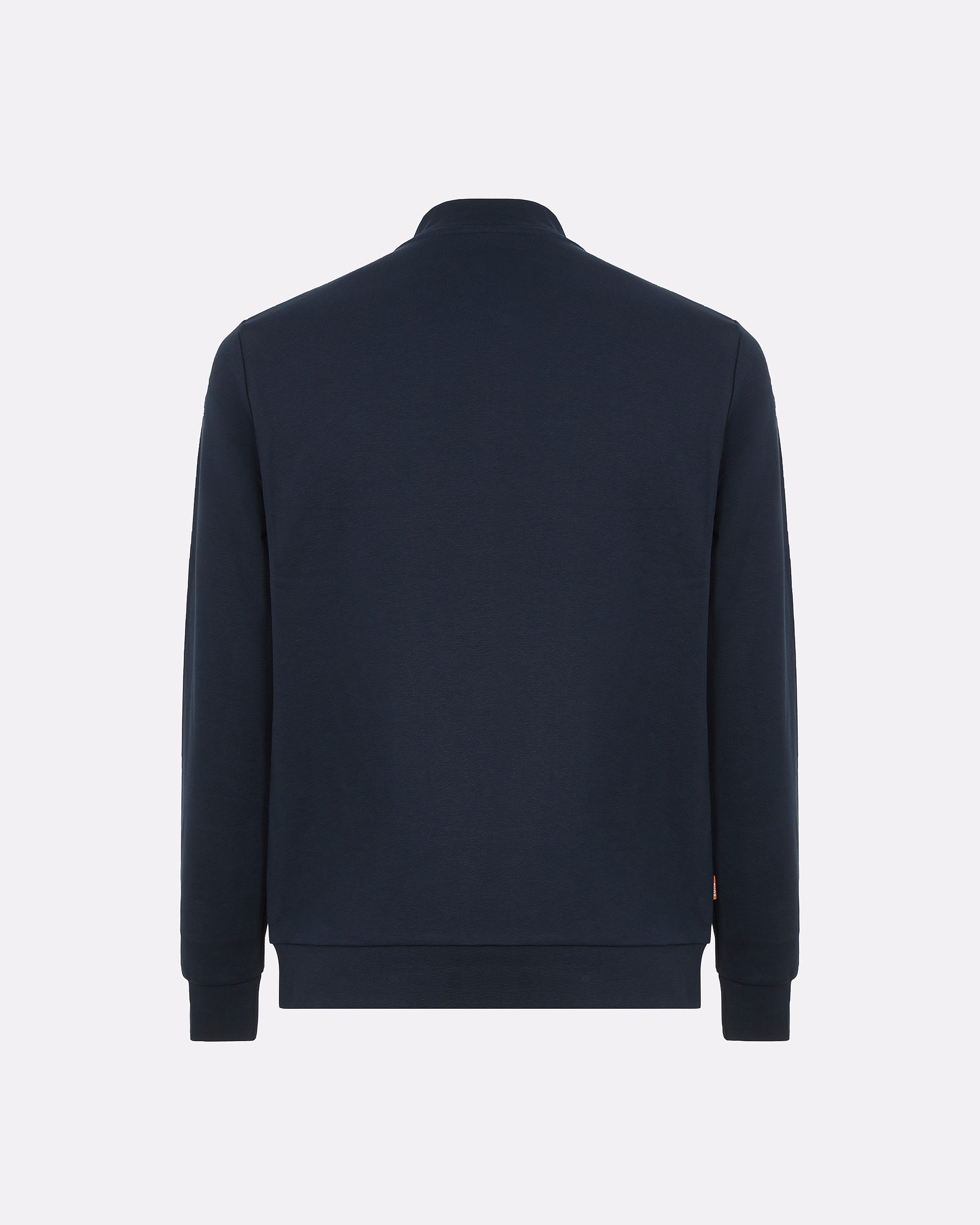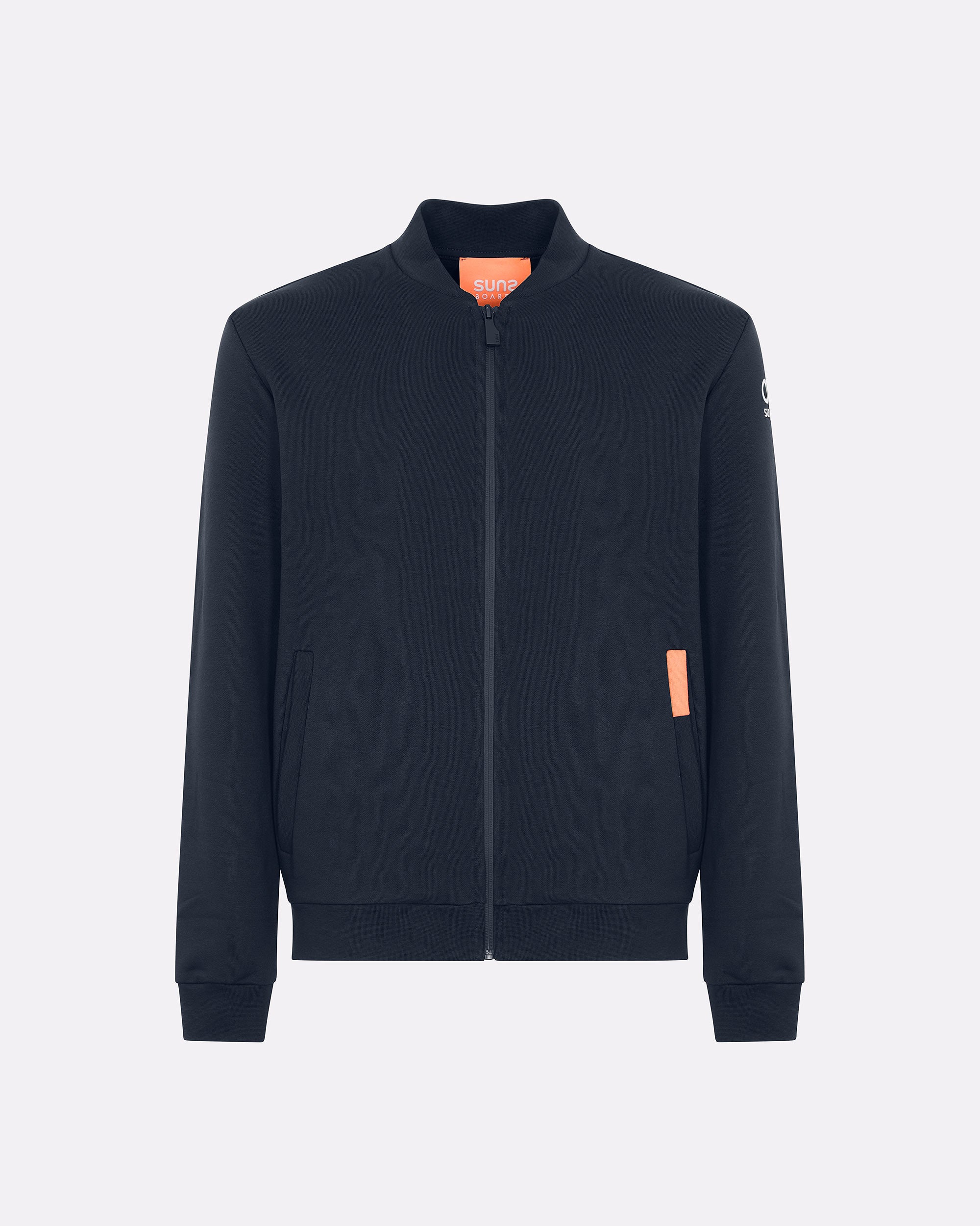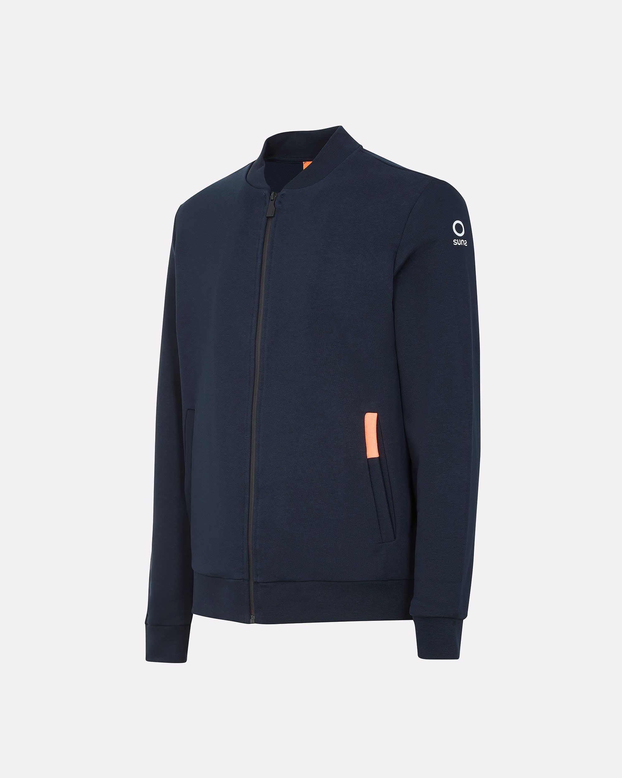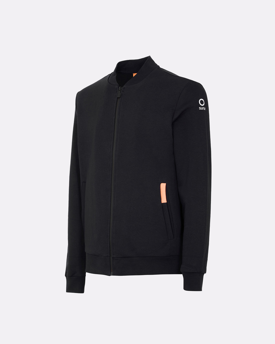 Un bomber in felpa da uomo perfetto per affrontare con stile le giornate più fresche. Realizzato in felpa diagonale 100% cotone con peso 350 gsm, questo modello combina comfort termico e resistenza. La chiusura frontale con zip bicolore waterproof è completata da un interno arancione a contrasto, mentre il collo, i polsi e il fondo in costina garantiscono una vestibilità comoda e aderente. Le tasche laterali a filetto aggiungono funzionalità senza sacrificare la pulizia del design. Il logo reflective Suns sulla manica e la pinnetta arancione fluo, elemento distintivo del brand Suns, sempre posizionata sul fianco lato destro, completano un look essenziale ma riconoscibile.