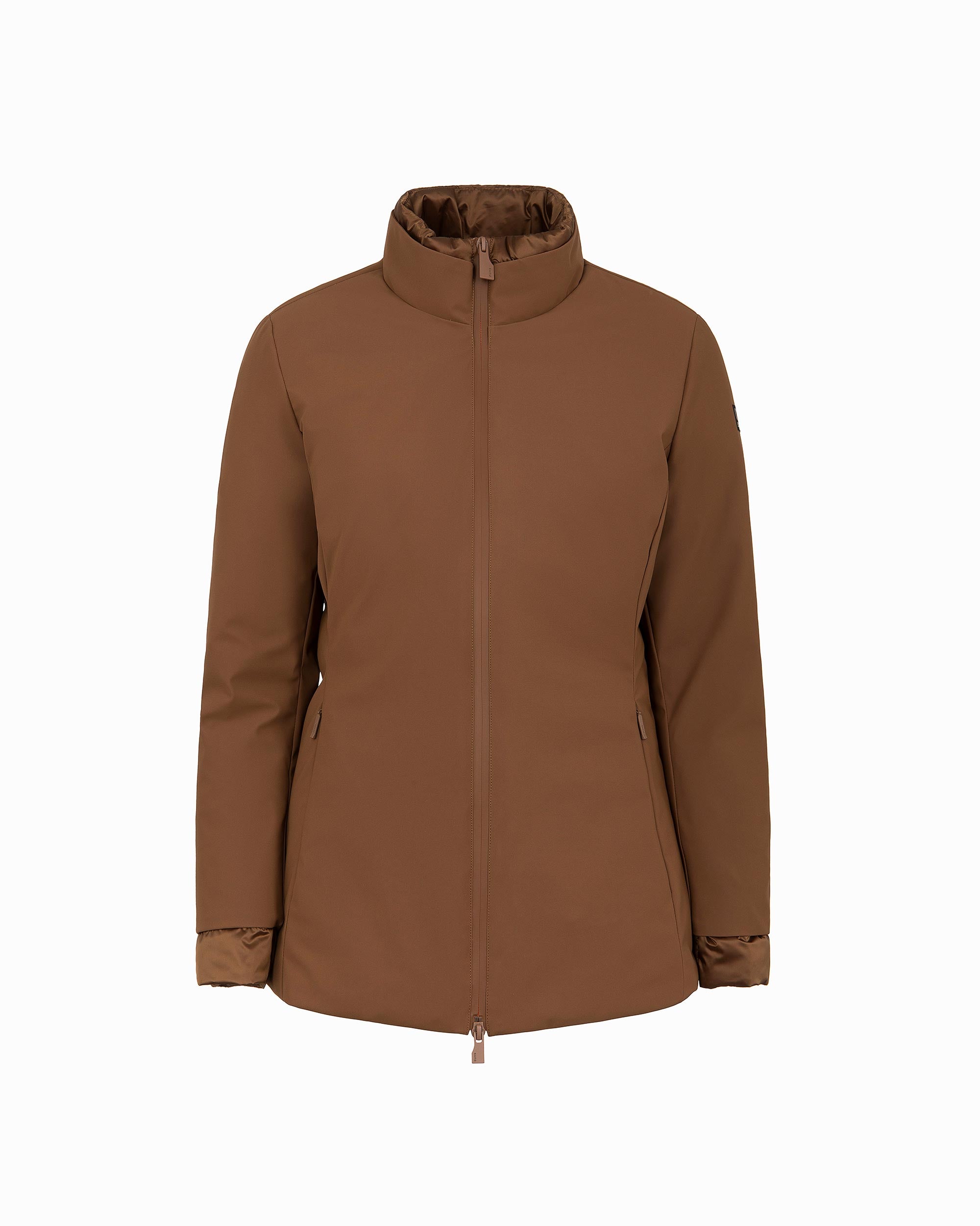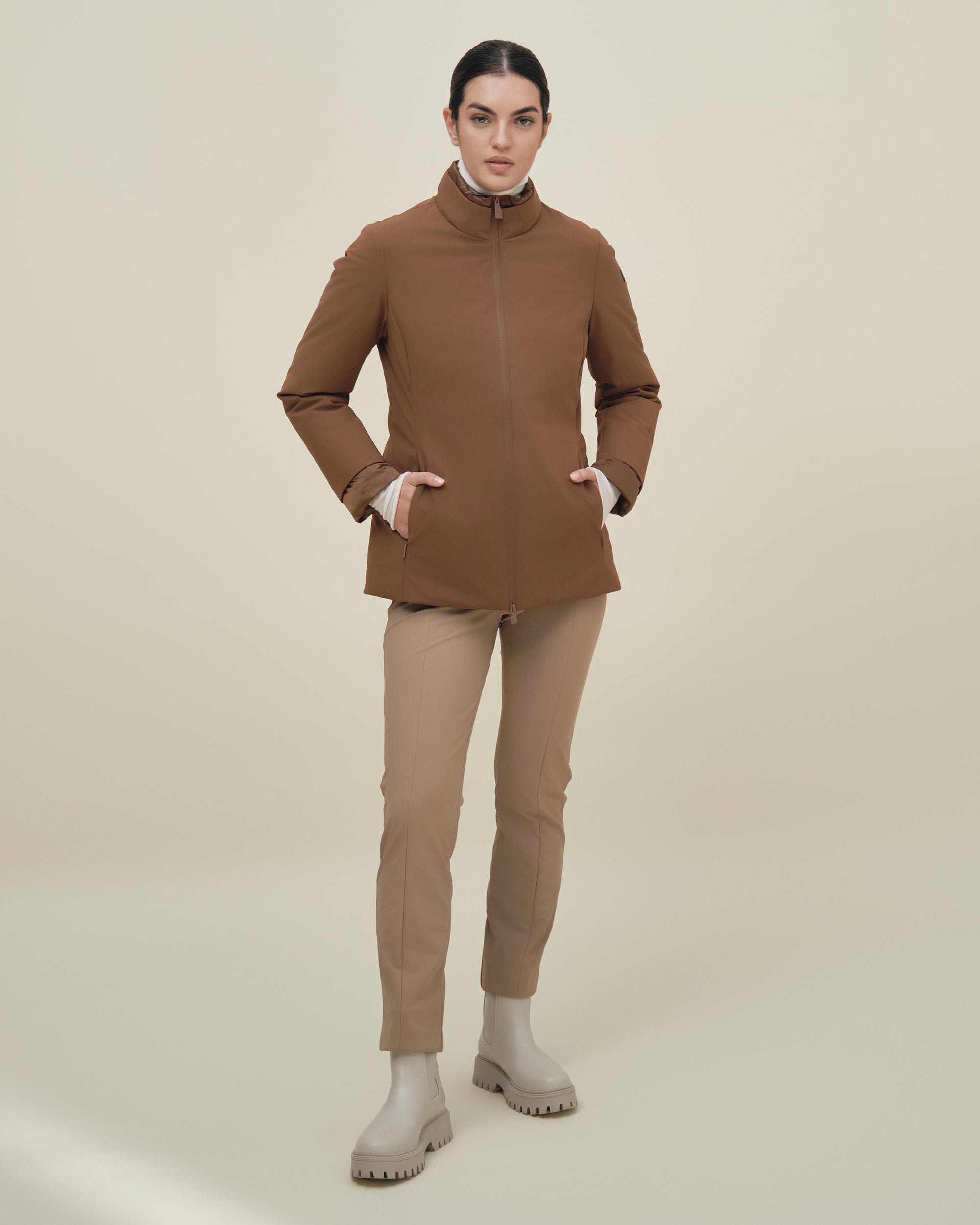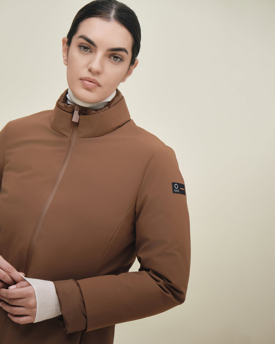 Collo alto stondato: protegge dal vento e aggiunge un tocco contemporaneo.