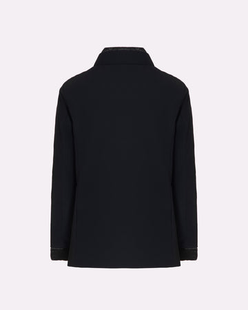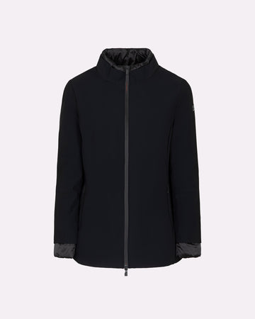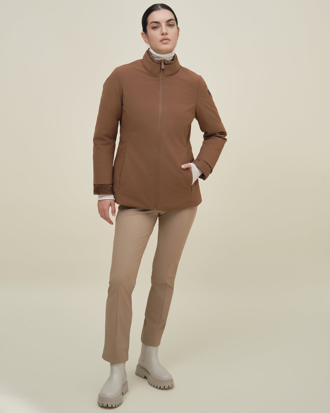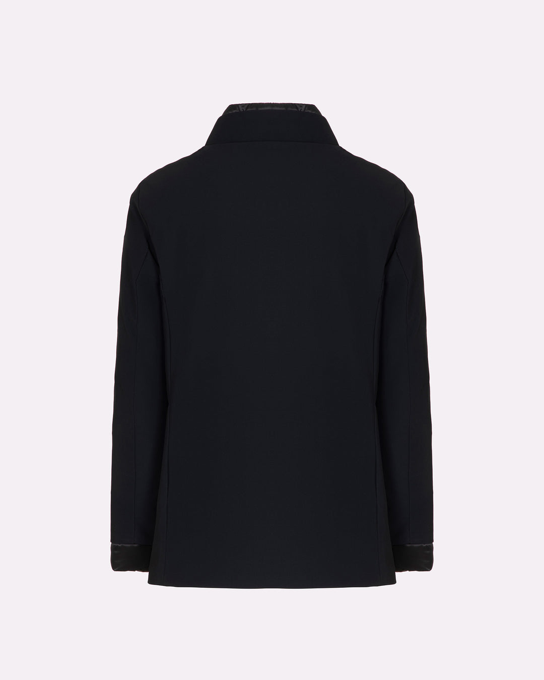 Collo alto stondato: protegge dal vento e aggiunge un tocco contemporaneo.