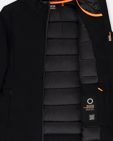 Questo giubbotto nero da donna unisce linee pulite a una costruzione tecnica pensata per affrontare la stagione più fredda. Il design è essenziale, con chiusura frontale a zip lunga termonastrata e collo alto leggermente stondato. L’interno trapuntato garantisce una imbottitura calda e avvolgente, mentre i polsini e i profili in nylon lucido aggiungono un tocco sofisticato e funzionale. La silhouette pulita e asciutta si adatta facilmente a diversi look invernali, offrendo comfort e protezione senza rinunciare allo stile.