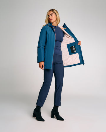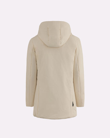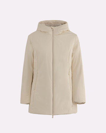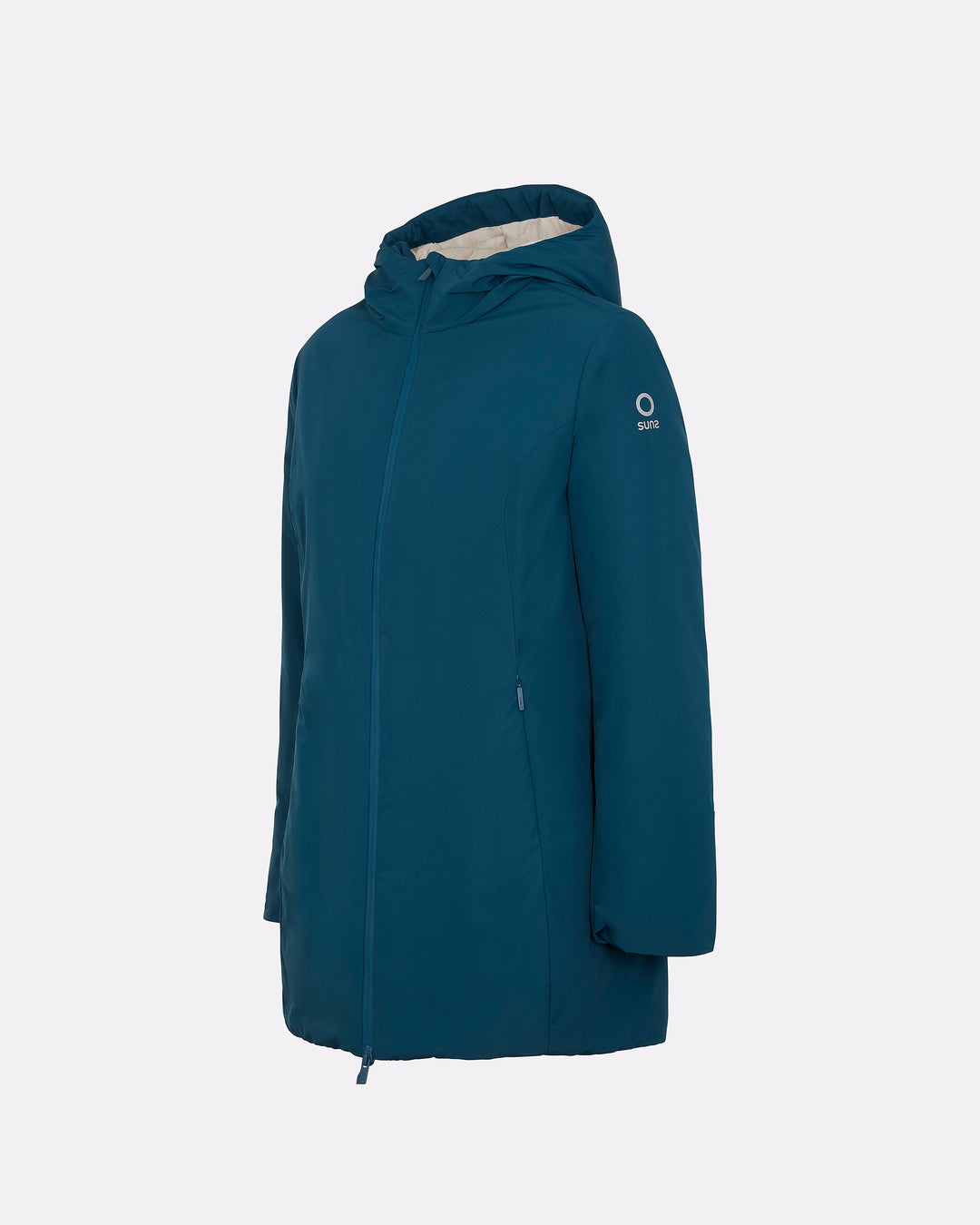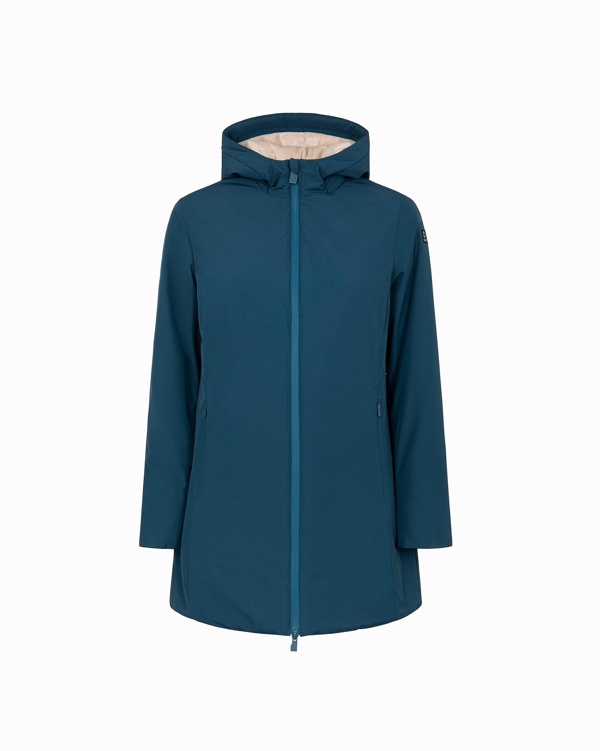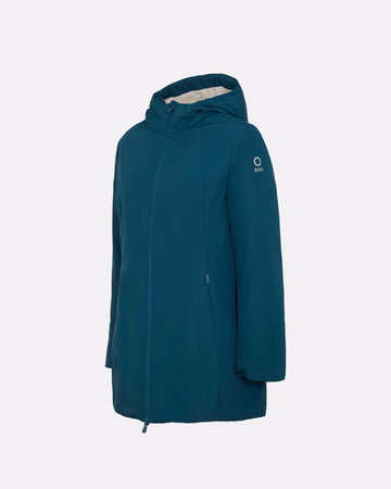 Giubbotto lungo da donna dal design essenziale e funzionale, pensato per garantire comfort e protezione nelle giornate più fredde. Il cappuccio fisso assicura copertura continua, mentre l’interno completamente rivestito in eco fur rasata offre calore e morbidezza. Il tessuto esterno impermeabile protegge efficacemente da pioggia e umidità, rendendo questo capo ideale anche per le condizioni meteo variabili. Completano il design la chiusura frontale con zip bicolore impermeabilecon interno arancione e doppio cursore, le tasche laterali e la pinnetta arancione fluo, elemento distintivo del brand Suns, sempre posizionata sul fianco lato destro.